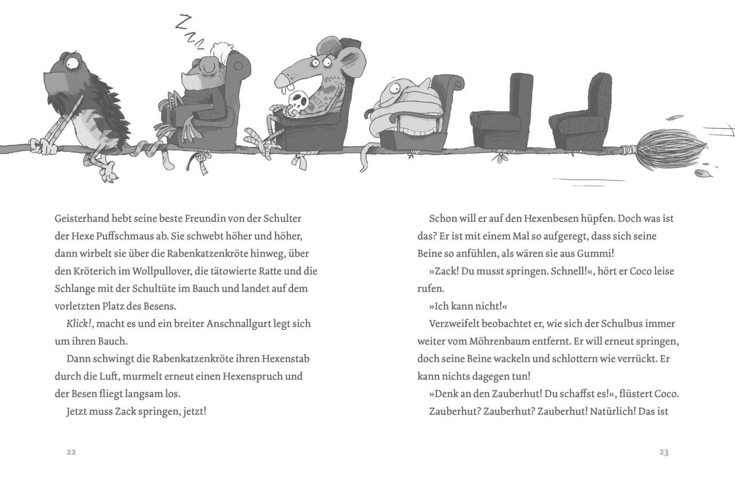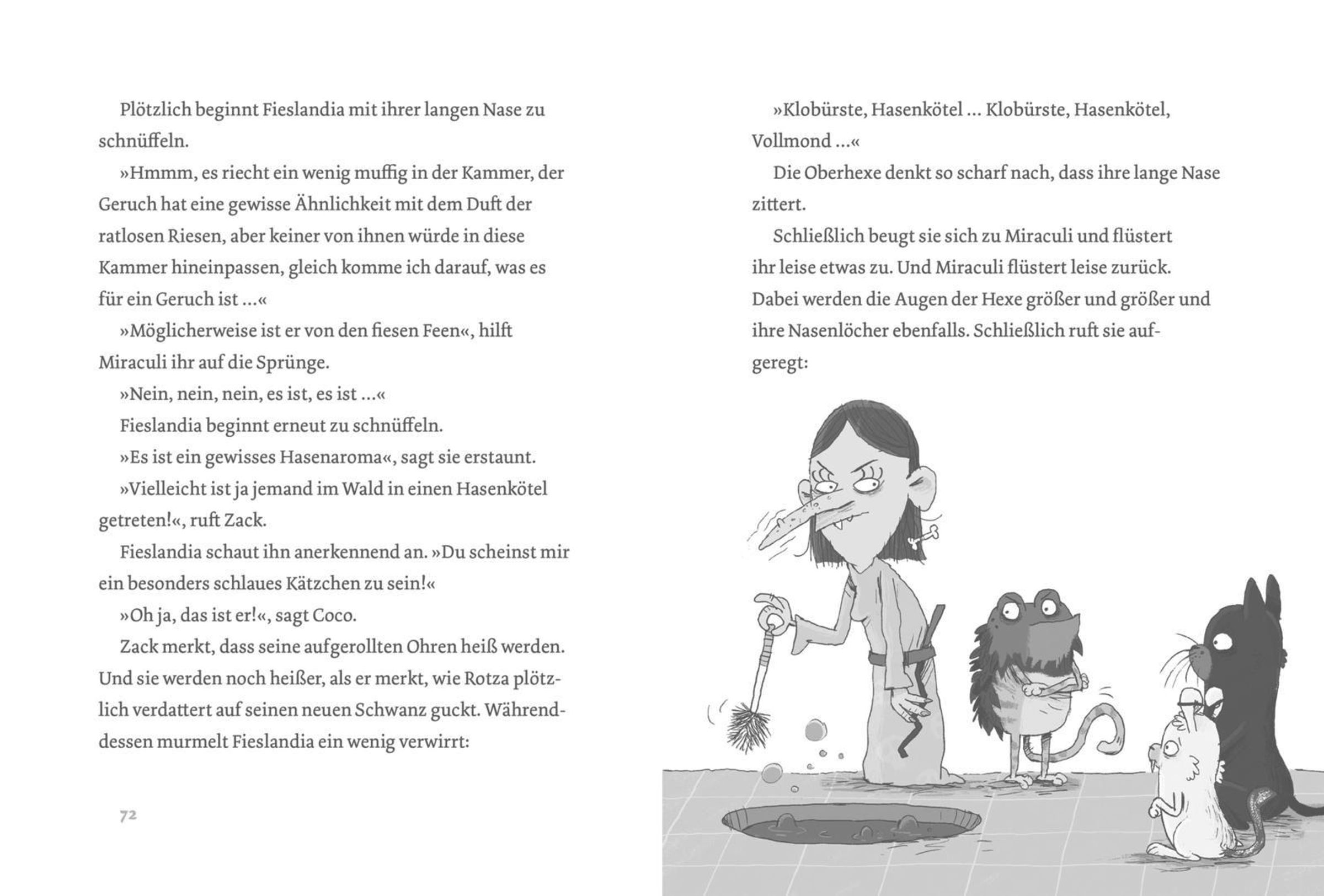 Zauberhuthase Zack und Hexenkatze Coco sind unzertrennlich. Doch dann wird Coco ins Internat für Hexentiere geschickt, das ausschließlich Katzen, Kröten, Schlangen, Spinnen, Raben und Ratten vorbehalten ist. Für die beiden steht natürlich fest: Zack muss mit! Und zwar undercover, als Hexenkatze verkleidet. Doch schon beim ersten Flug auf dem Hexenbesen verliert er seinen falschen Schwanz. Oje - ob der Schwindel auffliegt? Und ob die beiden den rätselhaften Fluch der Küchenschürze brechen können, der das Internat in Atem hält?