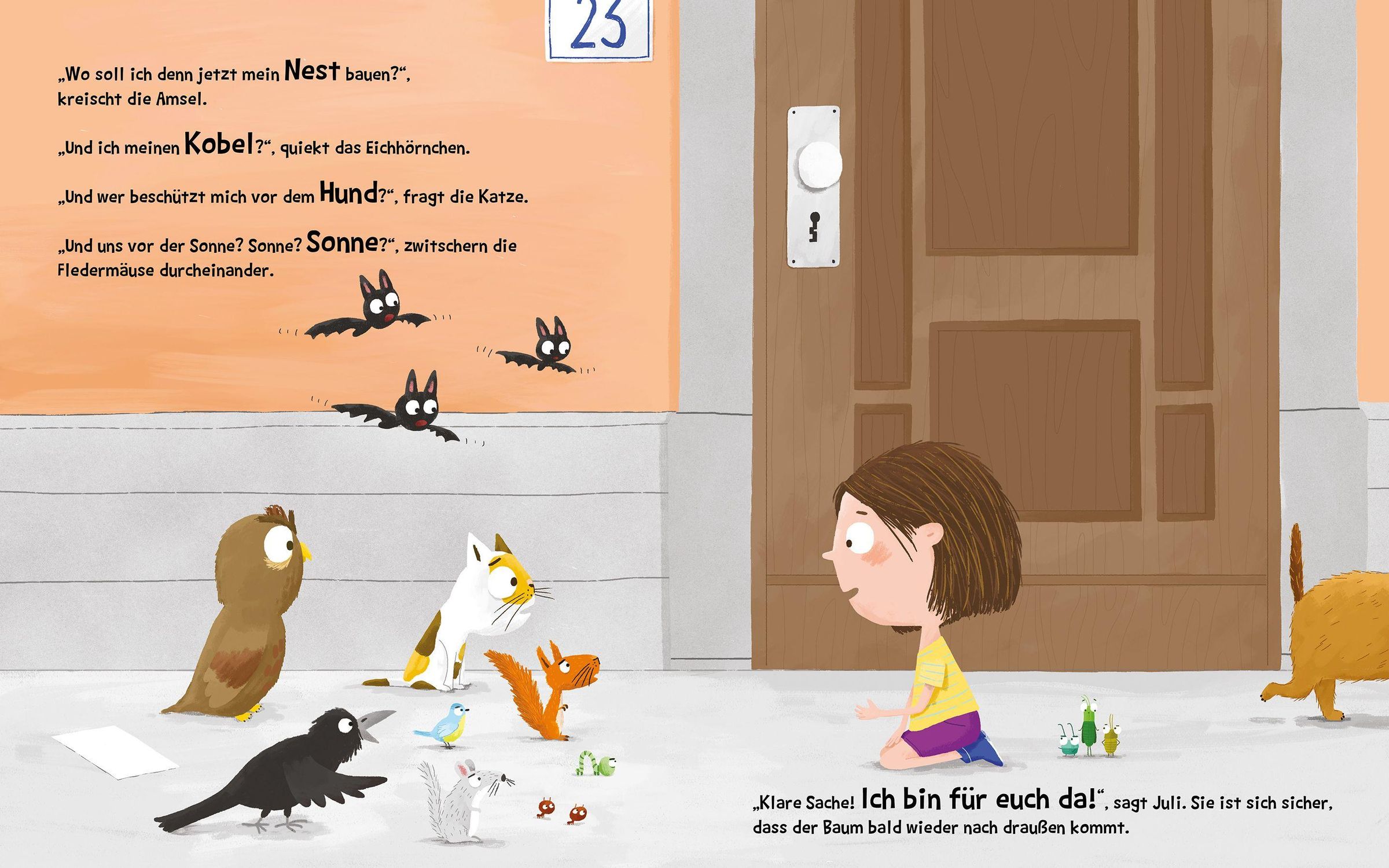 Juli hüpft durch den Park. Erst auf einem Bein bis zur Wippe. Dann auf dem anderen Bein bis zum ... oh Schreck! Der Baum ist weg! Juli sucht ihn überall, aber der Baum bleibt verschwunden. Wo soll die Amsel denn nun ihr Nest bauen? Und wo soll die Fledermaus schlafen?