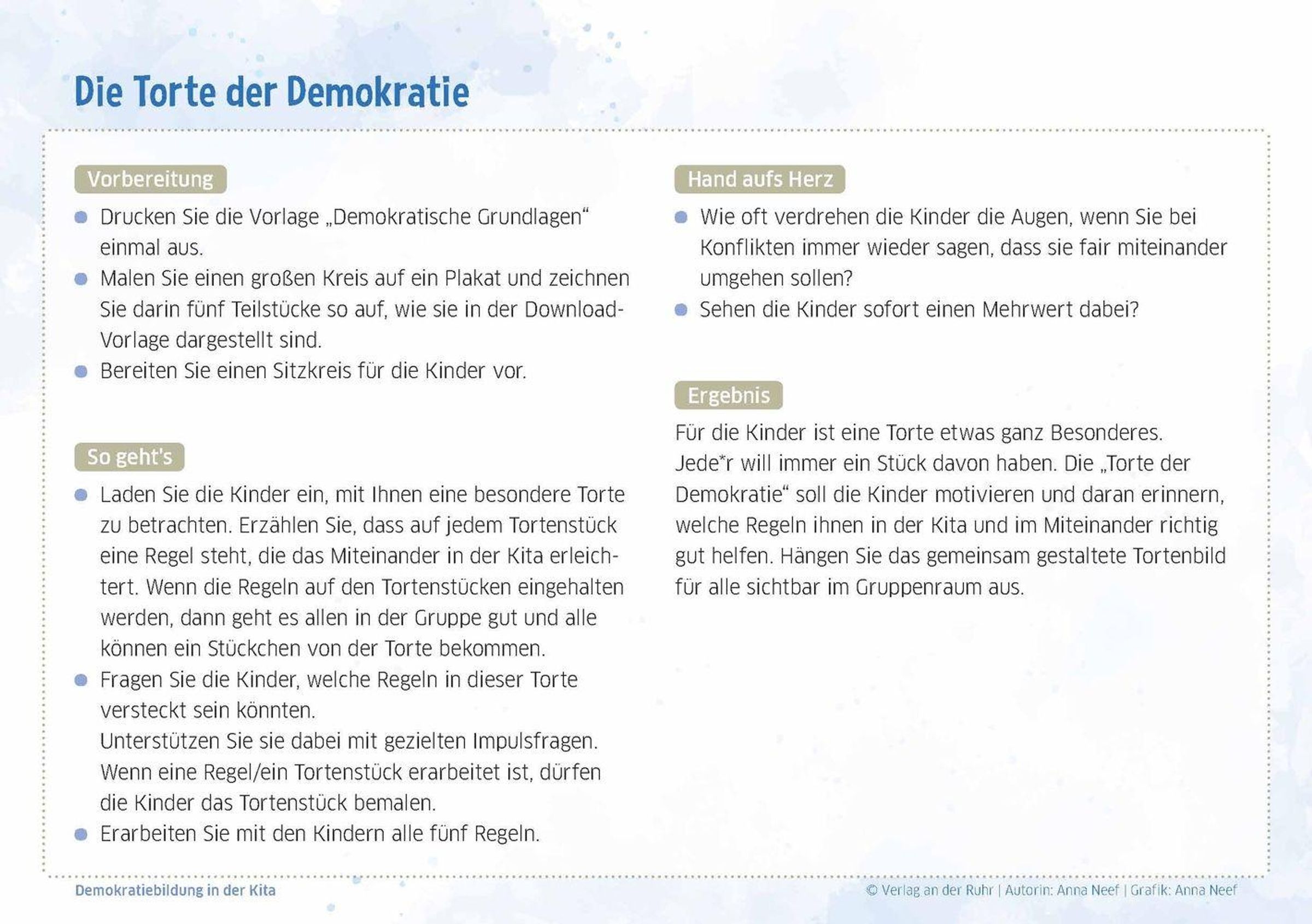 Kartenset mit über 30 Methoden für pädagogische Fachkräfte zur Demokratiebildung in der Kita +++ Demokratiebildung von Anfang an! Kinderrechte und Partizipation müssen für Kinder im Kita-Alter erfahrbar sein, damit diese Aspekte nachhaltig in ihnen wirken können. Von der Gestaltung eines Baums der Demokratie mit den Eltern über das Erzählen und Besprechen von Bilderbuch-Geschichten zum Thema "Demokratie" mit den Kindern - dieses Kartenset hilft Ihnen dabei, Demokratie für alle erlebbar zu machen. Es enthält:
