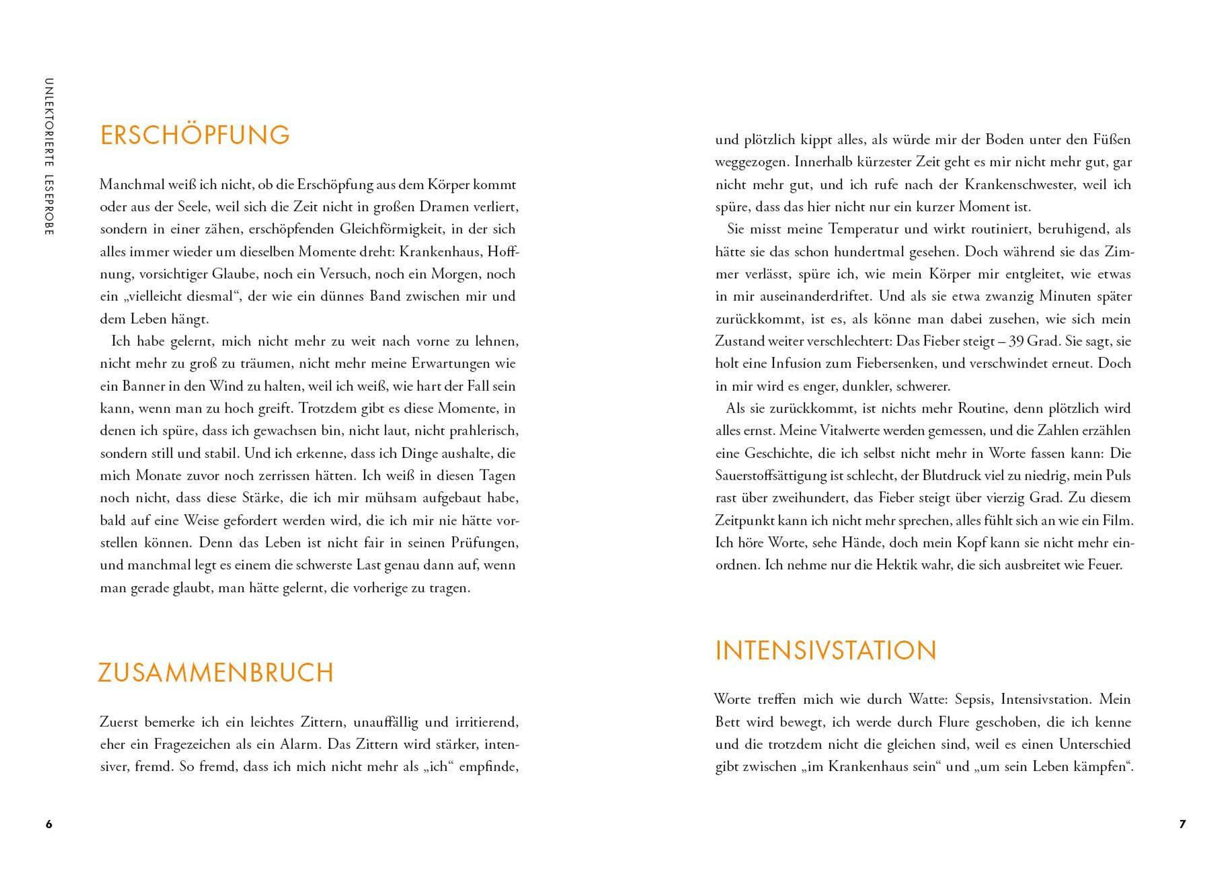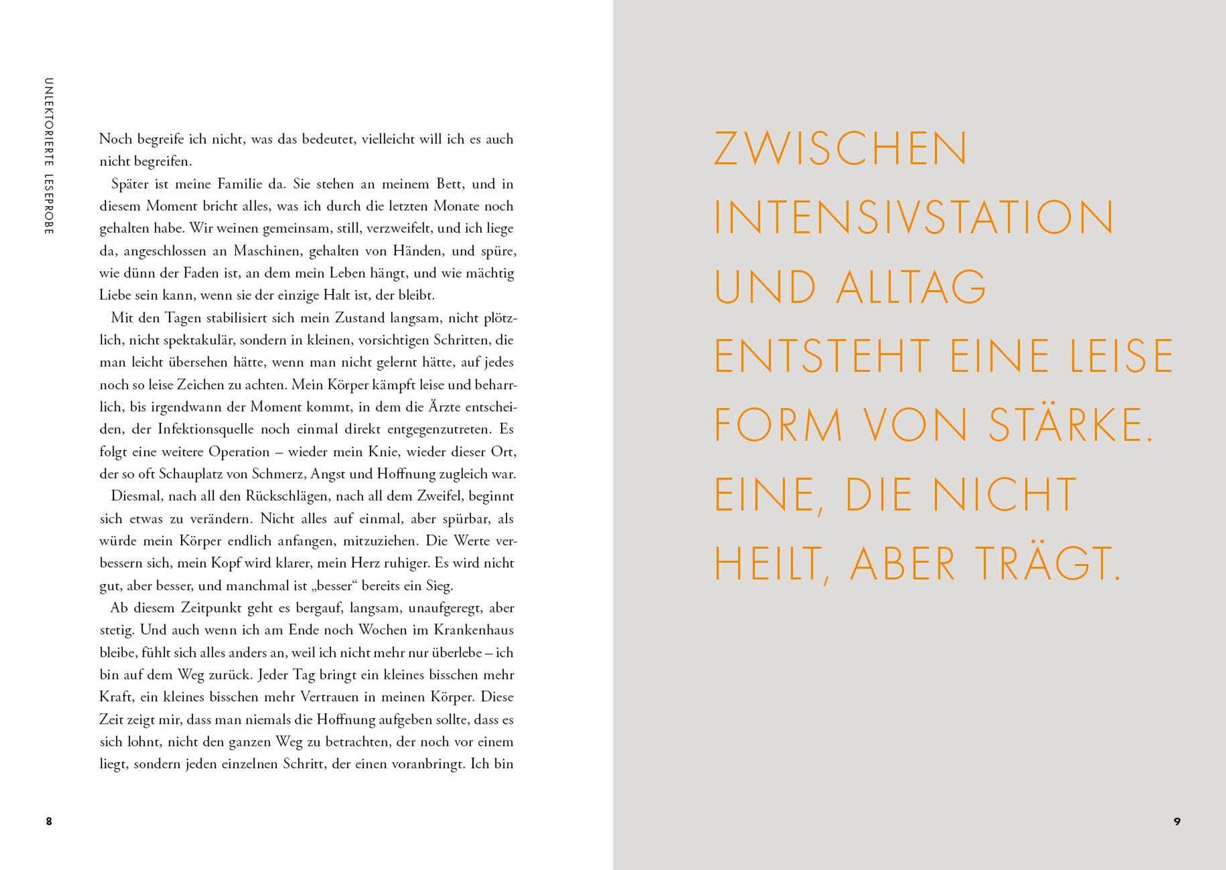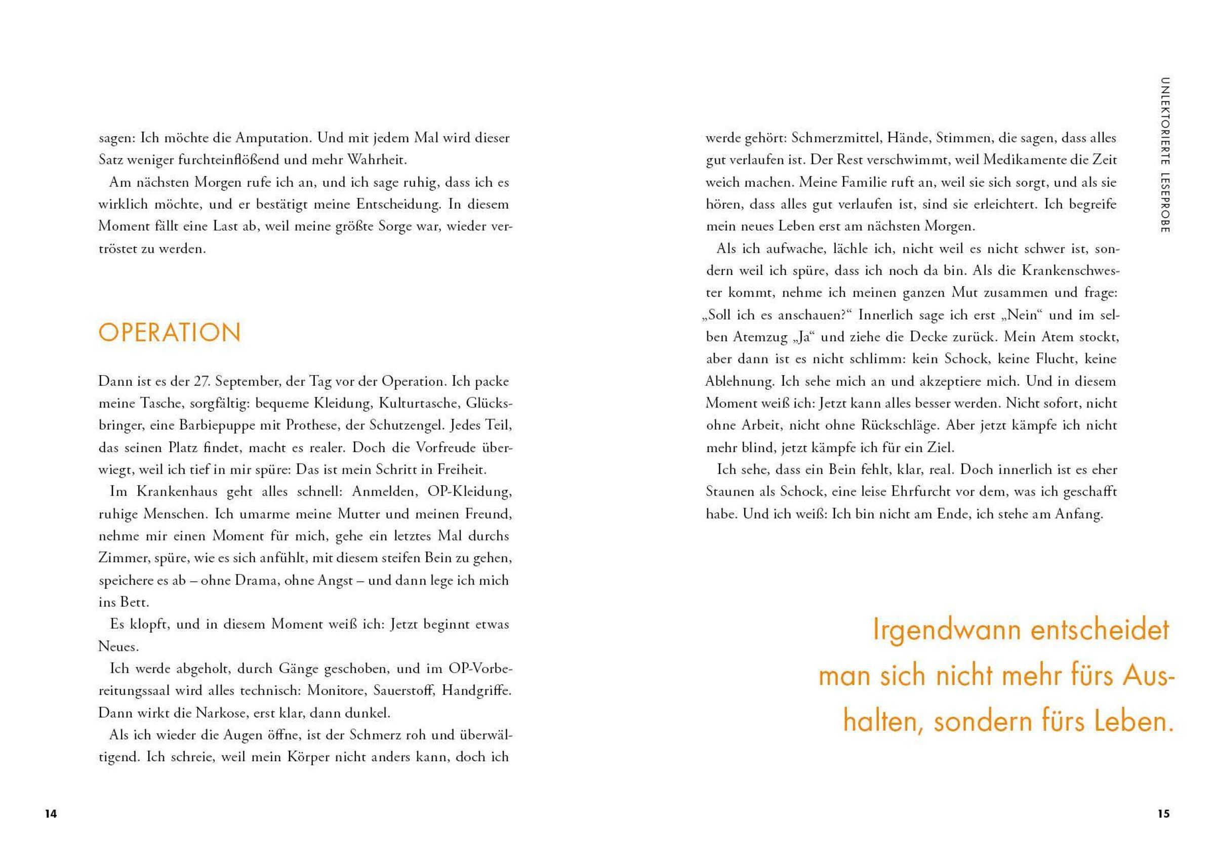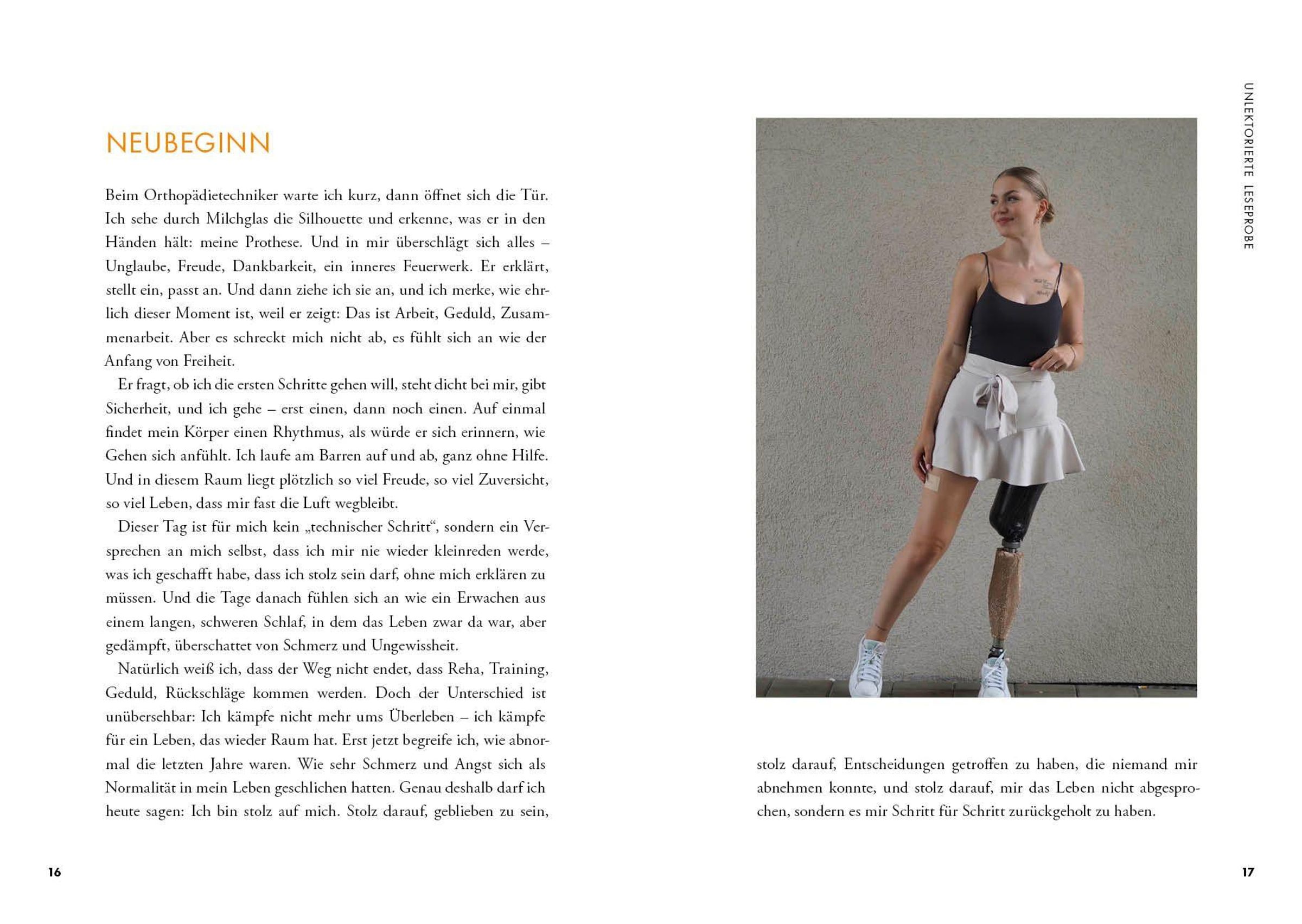 Sie erlebt Rückschläge, die kaum auszuhalten sind. Immer wieder steht sie an dem Punkt, an dem andere längst aufgegeben hätten. Doch Anna trifft eine Entscheidung: nicht zu zerbrechen, sondern weiterzugehen. Anders. Radikal. Denn Anna entscheidet sich für die Amputation. Und für das Leben.