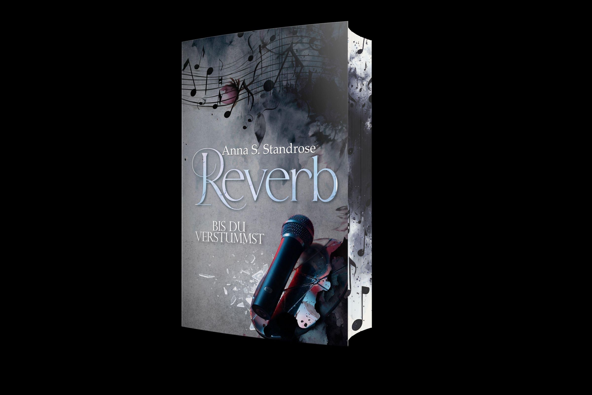"Anna S. Standrose, Reverb: Bis du verstummst". Ein Mikrofon liegt auf einer grauen Fläche, umgeben von Notenblättern., Buch