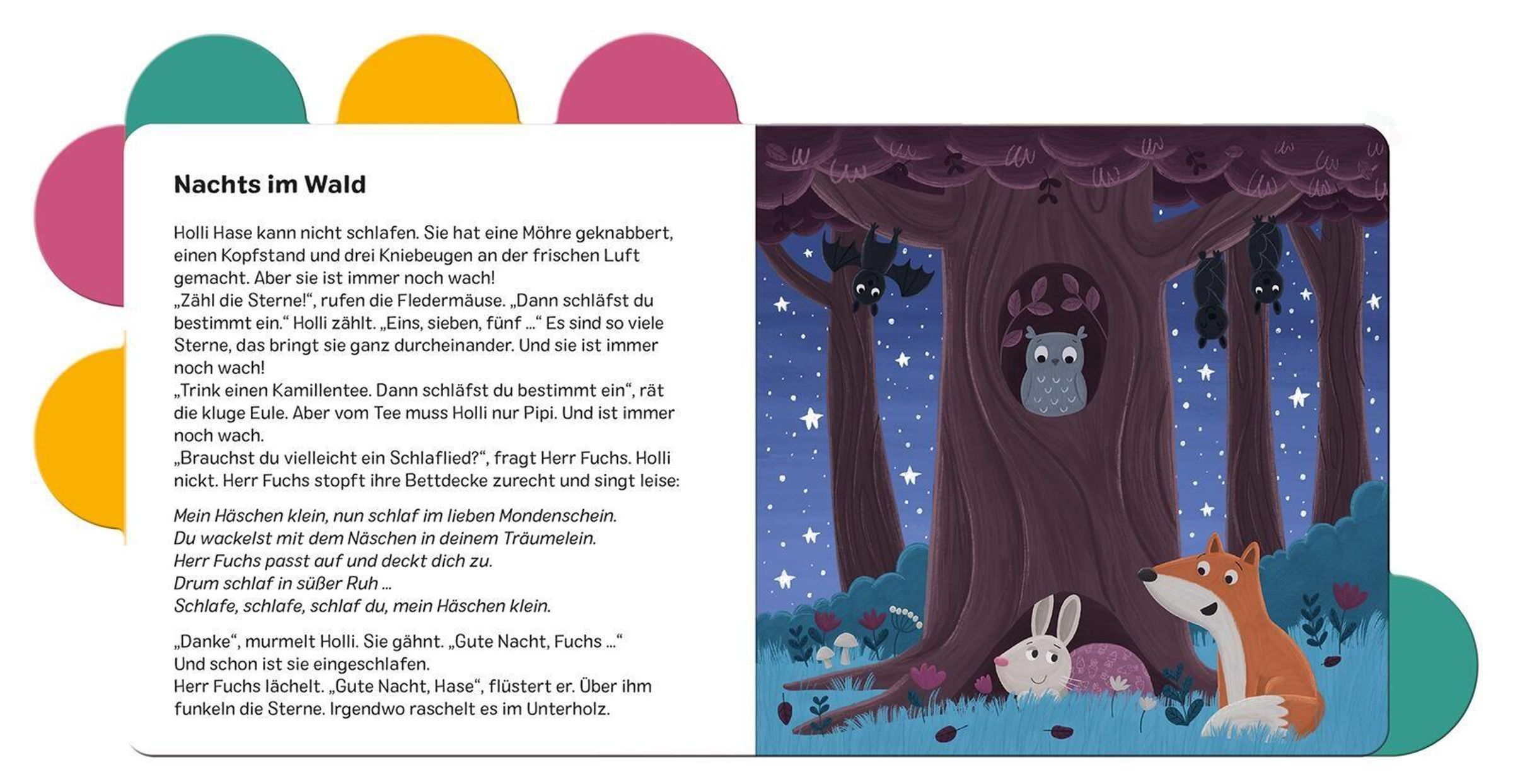 Im Wald bei den Tieren ist immer etwas los! Hase Holli braucht Hilfe beim Einschlafen, und Herr Igel hilft dem Eichhörnchen, seine Nuss zu suchen - dabei entdeckt er den perfekten Ort für den Winterschlaf. Und was erleben Waldfee Lilo und die 3 Spatzen?