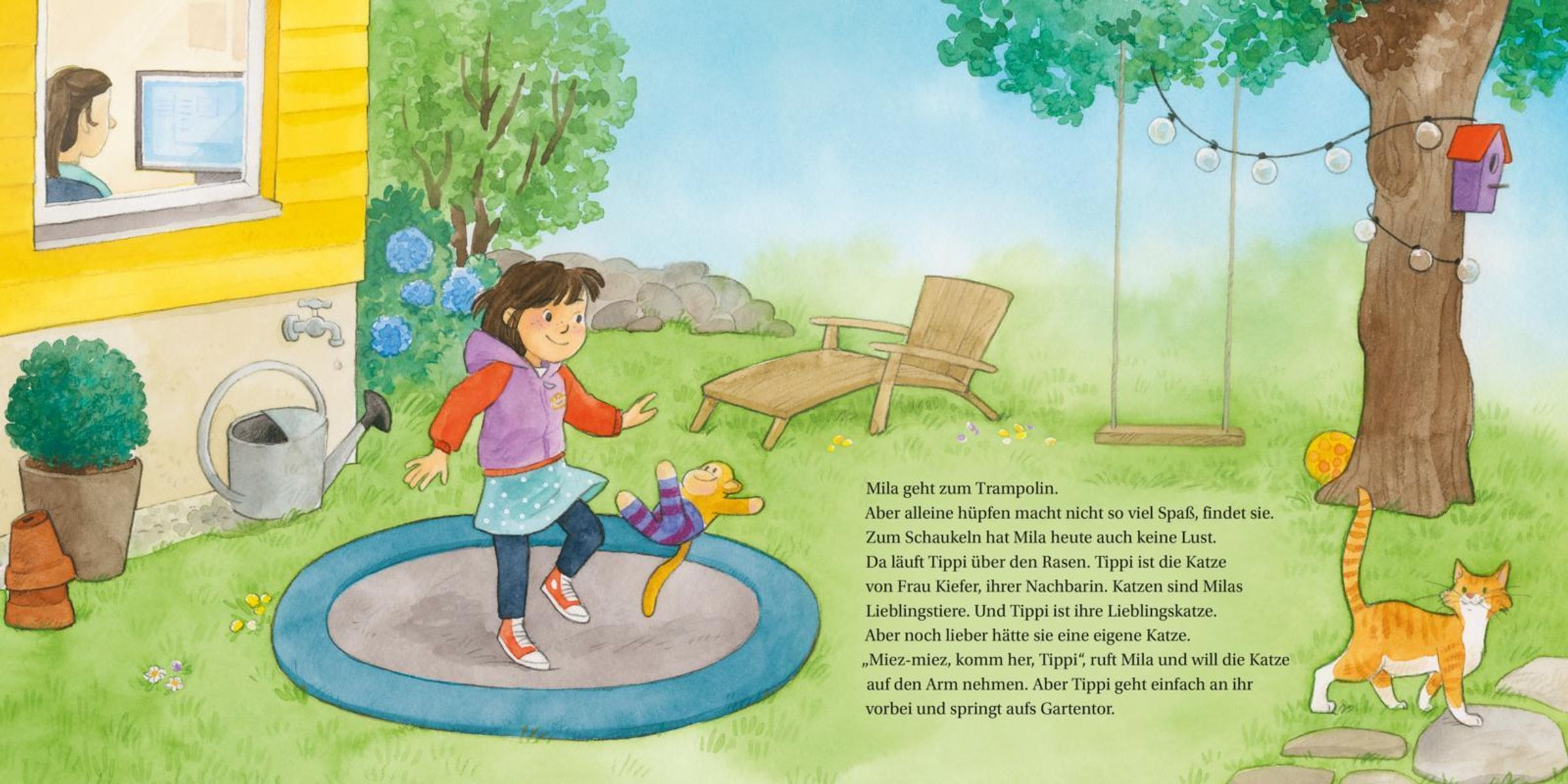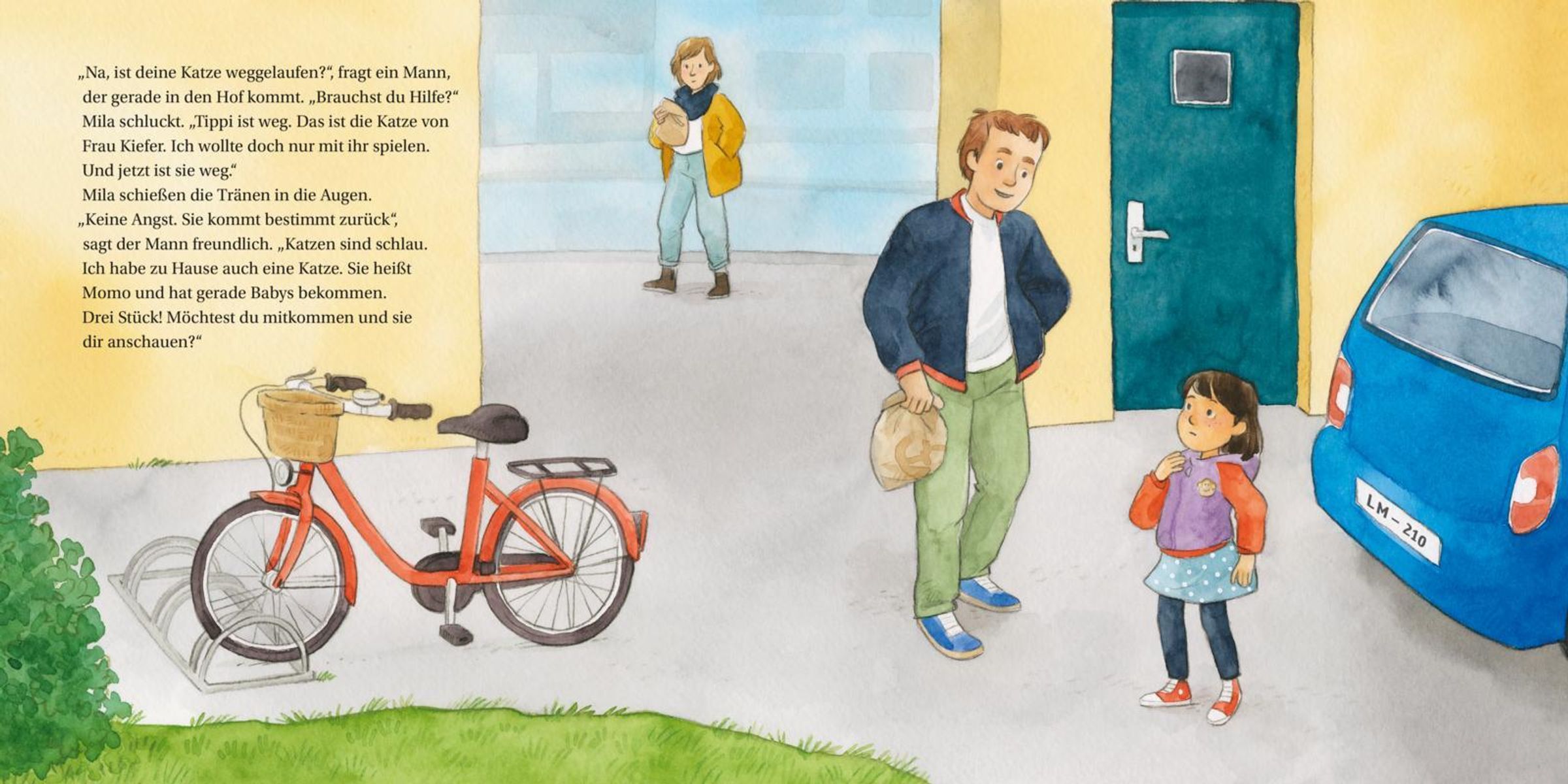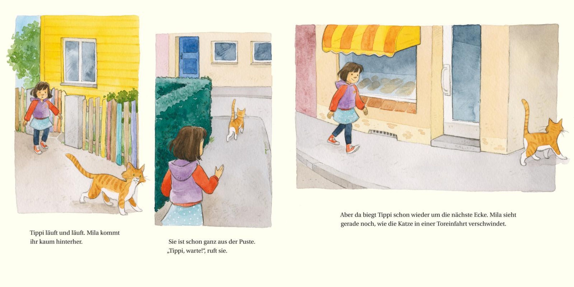Alleine im Garten zu spielen macht keinen Spaß, findet Mila. Da sieht sie eine Katze und läuft ihr schnell hinterher. Obwohl sie eigentlich nicht alleine von zu Hause weggehen darf! Und auf einmal ist da ein Mann, der Mila ein eigenes Kätzchen schenken will, wenn sie mitkommt. Aber Mila weiß genau: Ich geh doch nicht mit jedem mit!