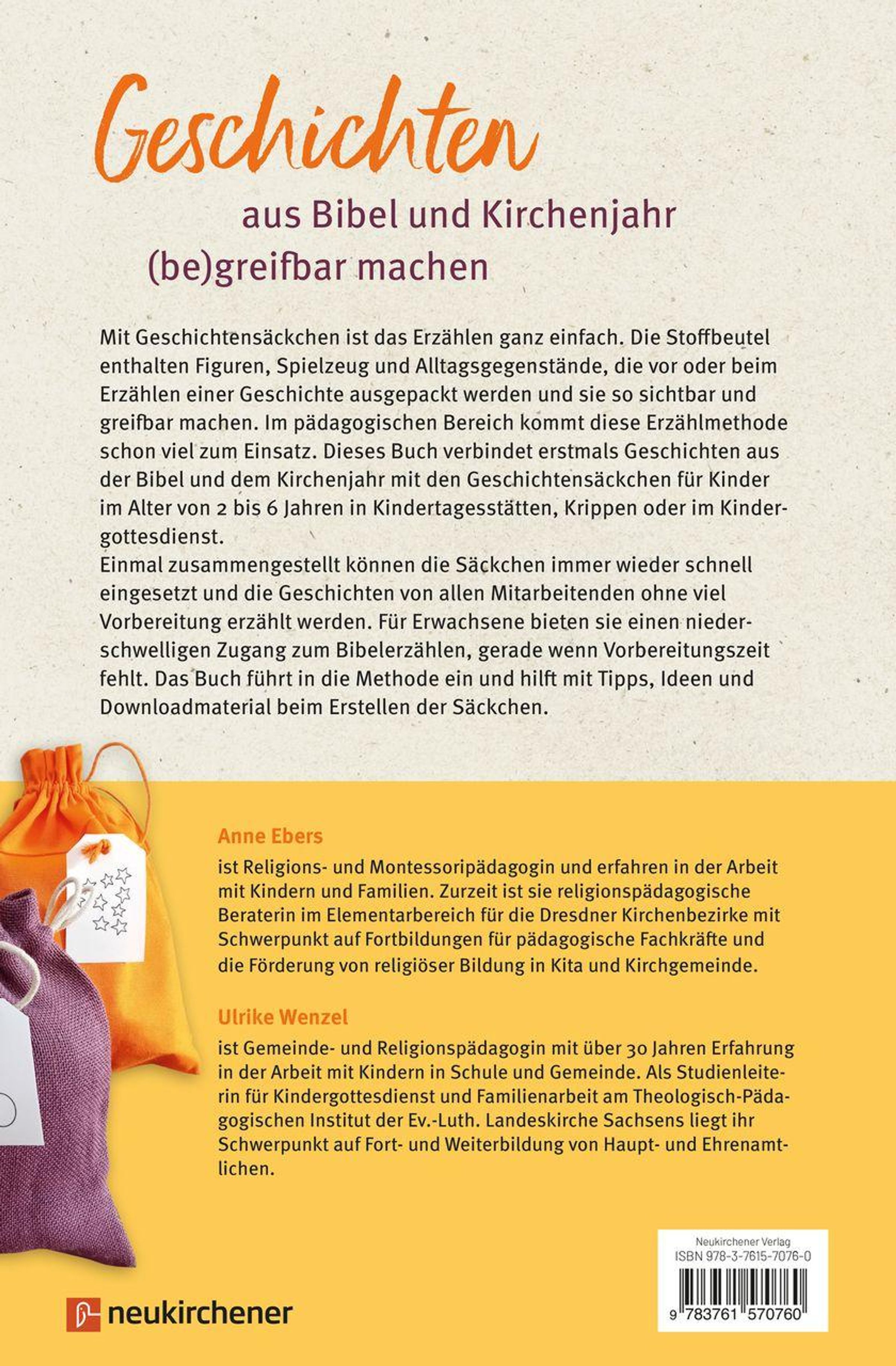 Geschichten lassen sich mit Geschichtensäckchen ganz einfach erzählen. Die Stoffbeutel enthalten Figuren, Spielzeug und Alltagsgegenstände, die vor oder beim Erzählen ausgepackt werden. Im pädagogischen Bereich kommt diese Erzählmethode schon viel zum Einsatz. Dieses Buch verbindet nun erstmals Geschichten aus der Bibel und dem Kirchenjahr mit den Geschichtensäckchen für Kinder im Alter von 2 bis 6 Jahren in Kindertagesstätte, Krippe oder Kindergottesdienst.