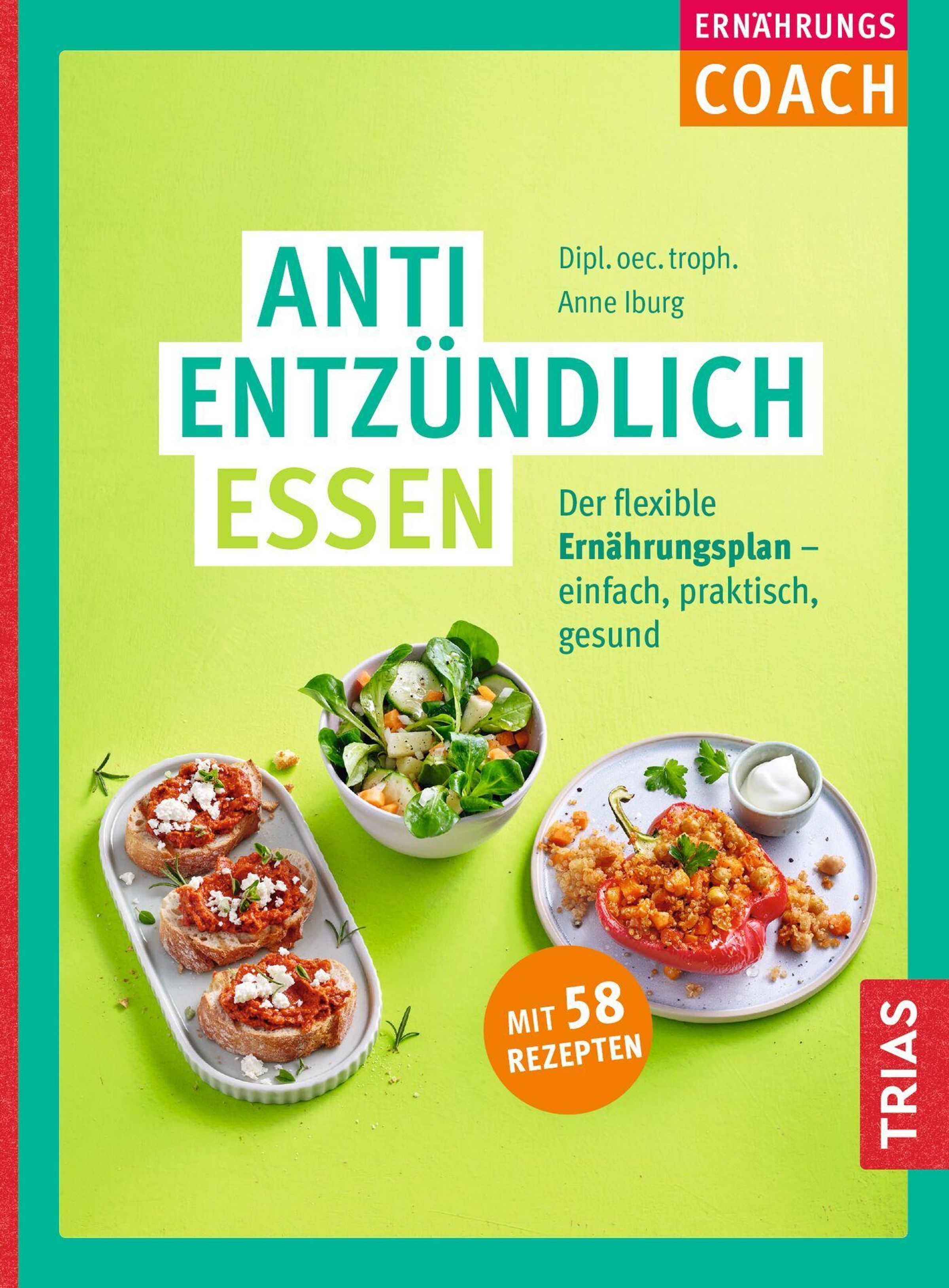 „ANTI ENTZÜNDLICH ESSEN“, Untertitel: „Mit 58 Rezepten“. Kochsalate, gefüllte Paprika und Brot mit Dip., Buch