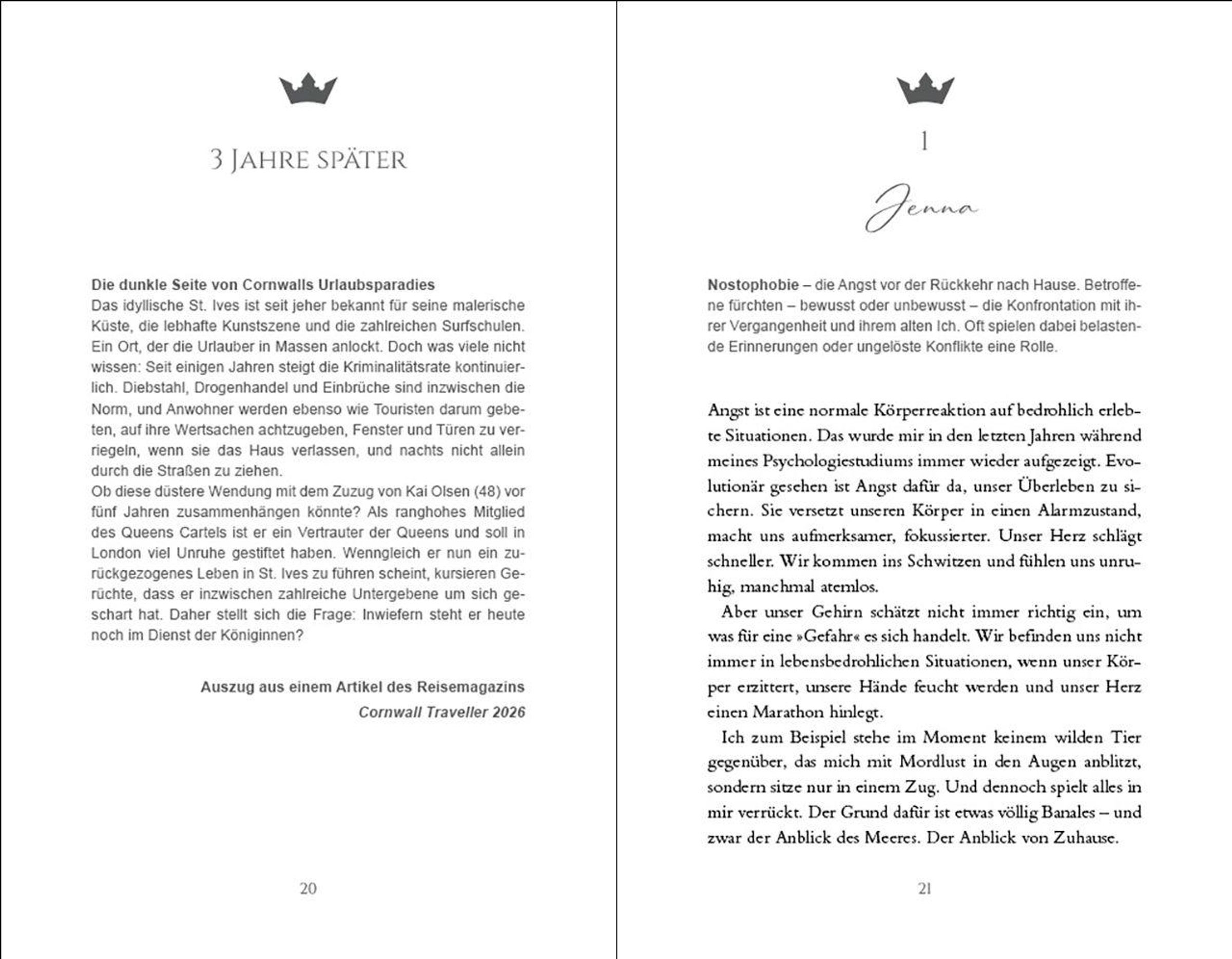 Jede Angst hat einen Ursprung ... Vor drei Jahren ist Jenna aus St. Ives weggezogen, um sich ihren Traum zu erfüllen: ein Psychologiestudium in Oxford. Als ihr Vater jedoch tödlich verunglückt, kehrt Jenna zurück in ihre Heimat, nur um schockiert festzustellen: Die idyllische Kleinstadt hat sich seit damals verändert. Denn das berüchtigte Queens Cartel hat Einzug gehalten und nicht nur ihr Bruder, sondern auch ihre Jugendliebe Ira scheinen Verbindungen zu der gefährlichen Gang zu haben. Abgesehen davon verschwinden immer mehr Menschen spurlos. Und bald schon muss Jenna um diejenigen fürchten, die sie liebt ...