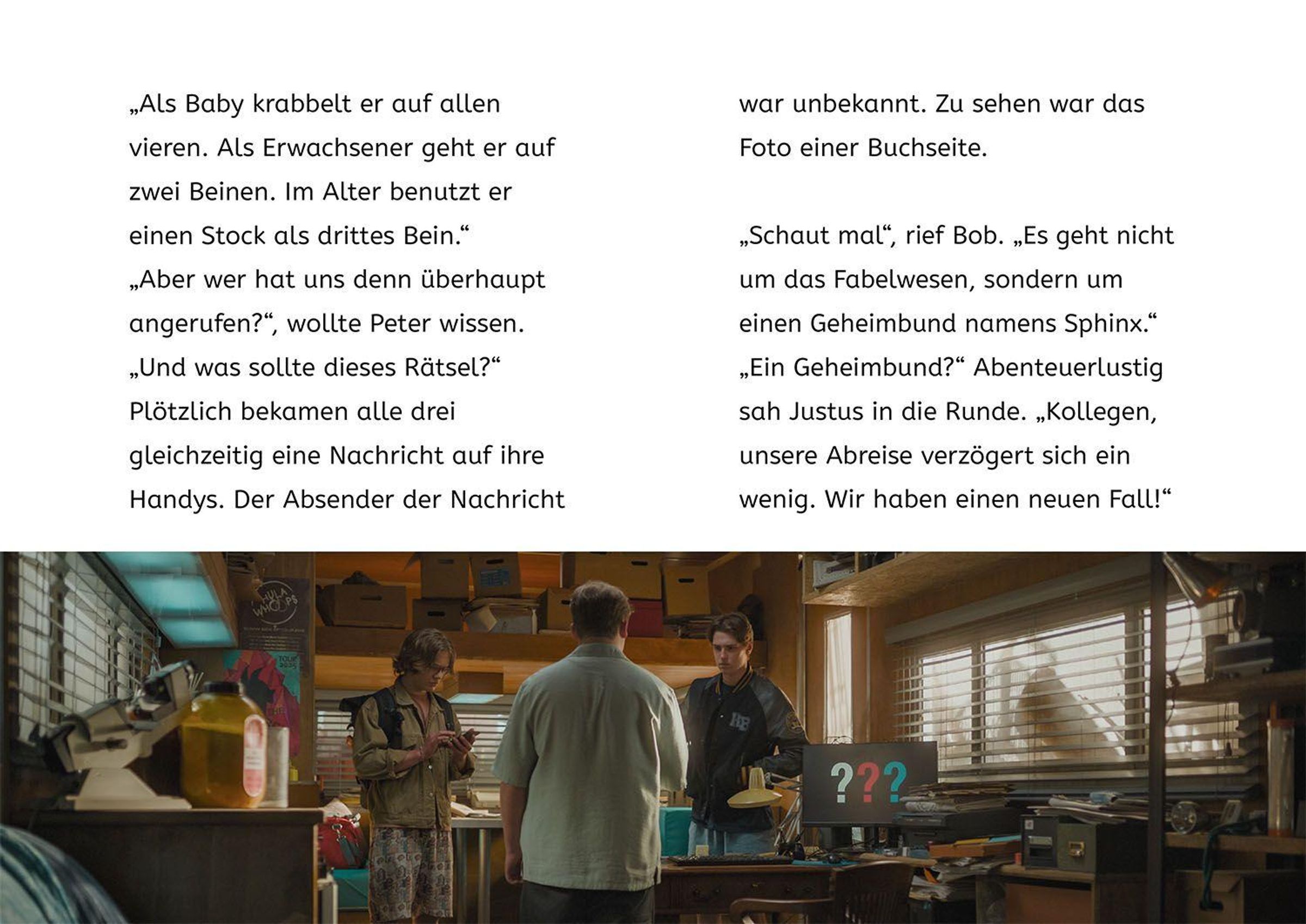 Ein neuer Kriminalfall für die beliebten Detektive aus Rocky Beach. "Löst das Rätsel der Sphinx oder jemand wird sein Leben verlieren." Justus, Peter und Bob trauen ihren Ohren kaum, als sie die bedrohliche Stimme am anderen Ende der Leitung hören. Plötzlich verstummt sie. Was ist geschehen? Noch wissen die Detektive aus Rocky Beach nicht, dass sie am Anfang eines mysteriösen Falls stehen. Ein verschollener Schatz, eine geheime Organisation und seltsame Ereignisse: Das Erstlesebuch zum Kinofilm. Ein spannender Fall mit vielen Fotos und übersichtlichem Schriftbild.