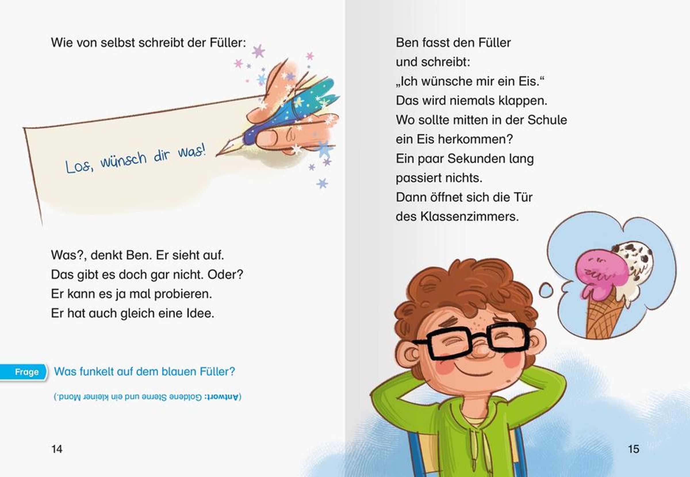 An diesem Schultag ist alles anders: In seinem Federmäppchen findet Ben einen verzauberten Füller. Wenn Ben mit diesem Füller einen Wunsch aufschreibt, geht er in Erfüllung. Da ist einiges los im Klassenzimmer! Alle Schülerinnen und Schüler aus Bens Klasse und die Lehrerin bekommen ein Eis und in der Turnhalle wartet ein echter Affe auf sie. So könnte der Schulunterricht jeden Tag sein.