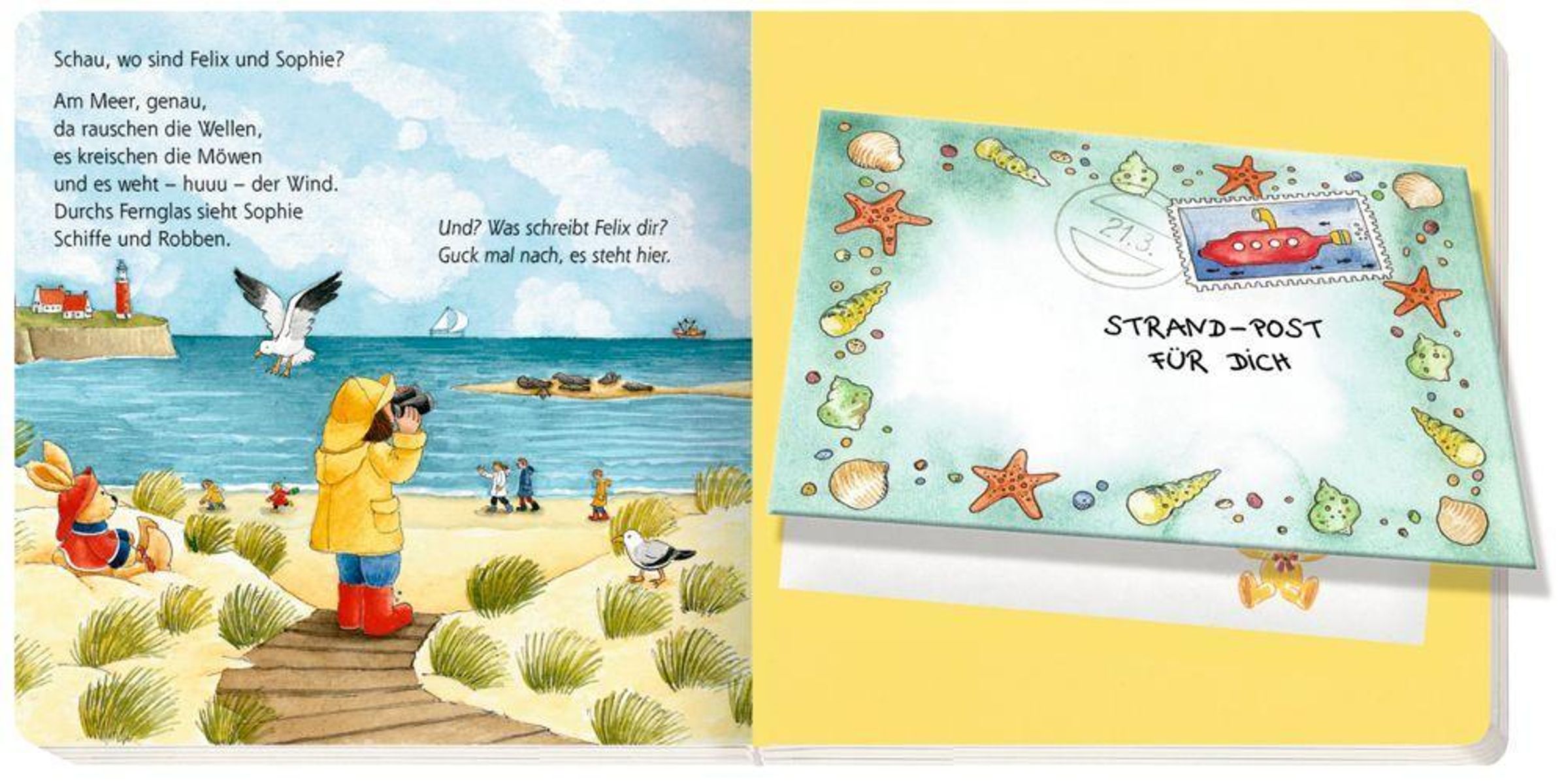 Hinter großen Klappen verbergen sich erste Briefe für die Kleinen, die Felix von seiner Weltreise schickt. Liebevolle Texte und kurze Fragen animieren das Kind zum Mitmachen und Entdecken!