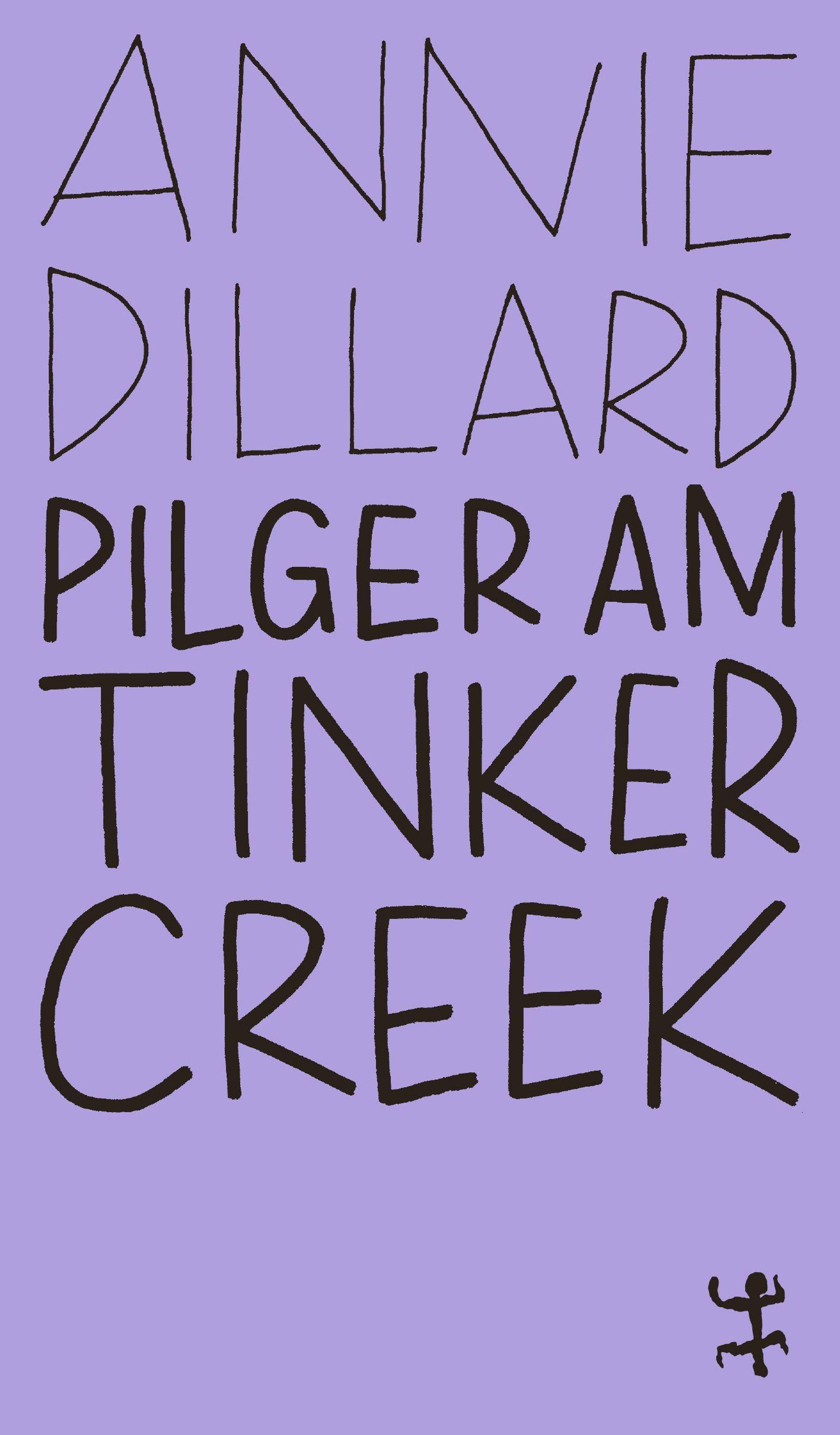 ANNIE DILLARD PILGER AM TINKER CREEK, lila Hintergrund, schwarze handschriftliche Buchstaben, kleines Symbol unten rechts., Buch