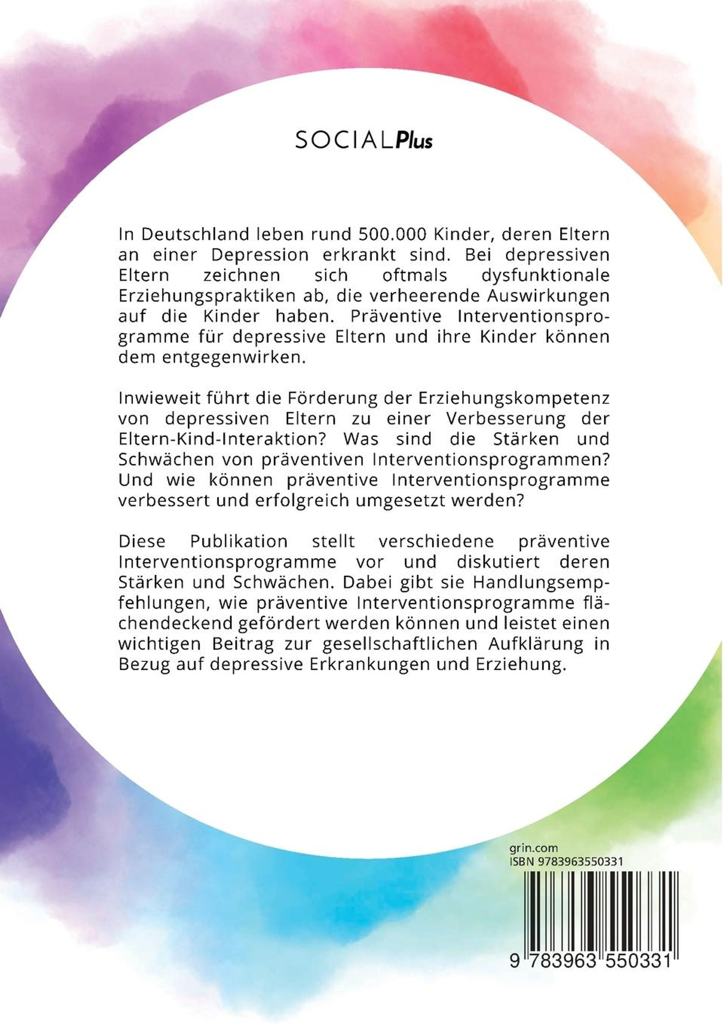 Diese Publikation stellt verschiedene präventive Interventionsprogramme vor und diskutiert deren Stärken und Schwächen. Dabei gibt sie Handlungsempfehlungen, wie präventive Interventionsprogramme flächendeckend gefördert werden können und leistet einen wichtigen Beitrag zur gesellschaftlichen Aufklärung in Bezug auf depressive Erkrankungen und Erziehung.