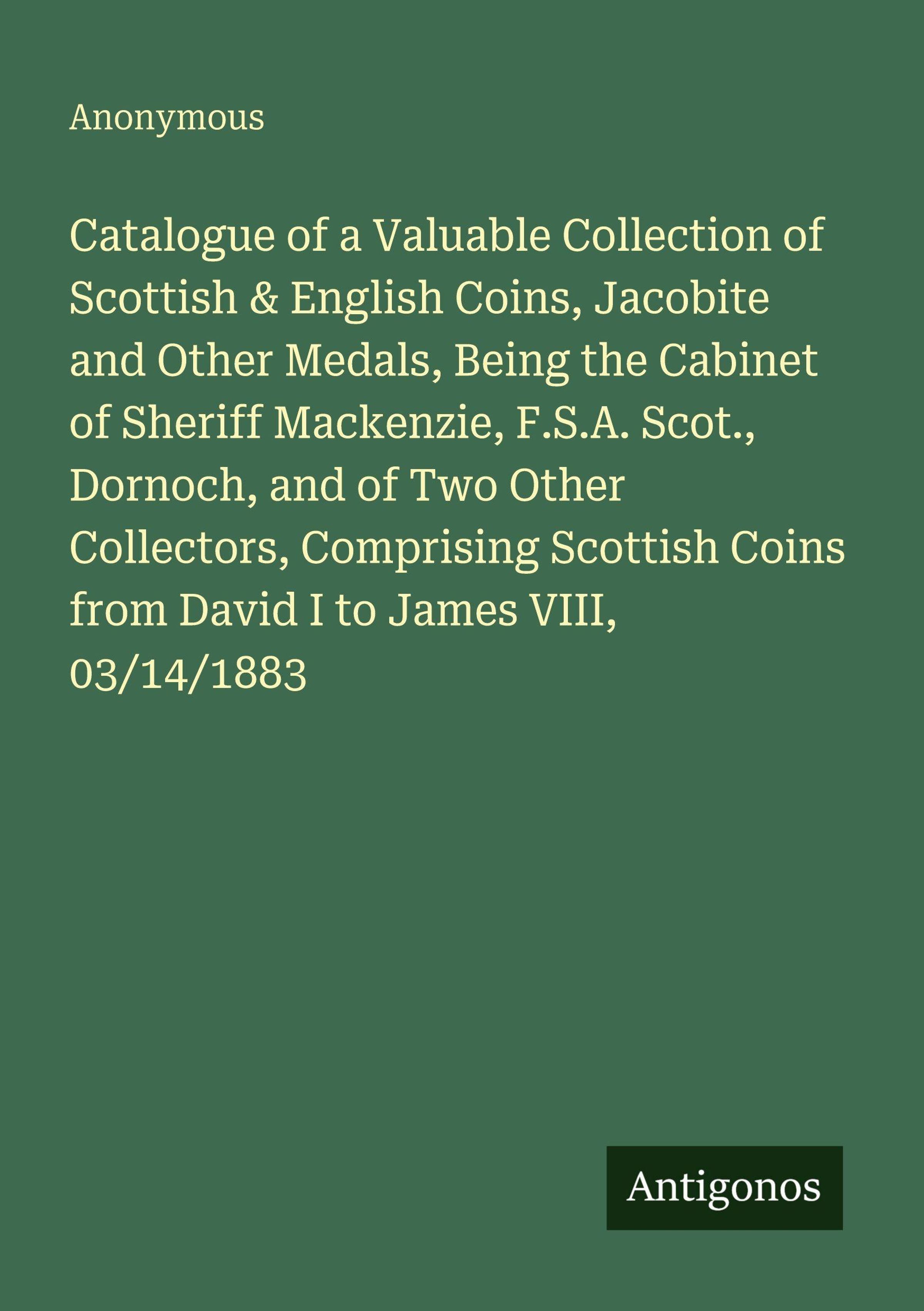 Catalogue of a Valuable Collection of Scottish & English Coins, Jacobite and Other Medals, Being the Cabinet of Sheriff Mackenzie, F.S.A. Scot., Dornoch, and of Two Other Collectors, Comprising Scottish Coins from David I to James VIII, 03/14/1883