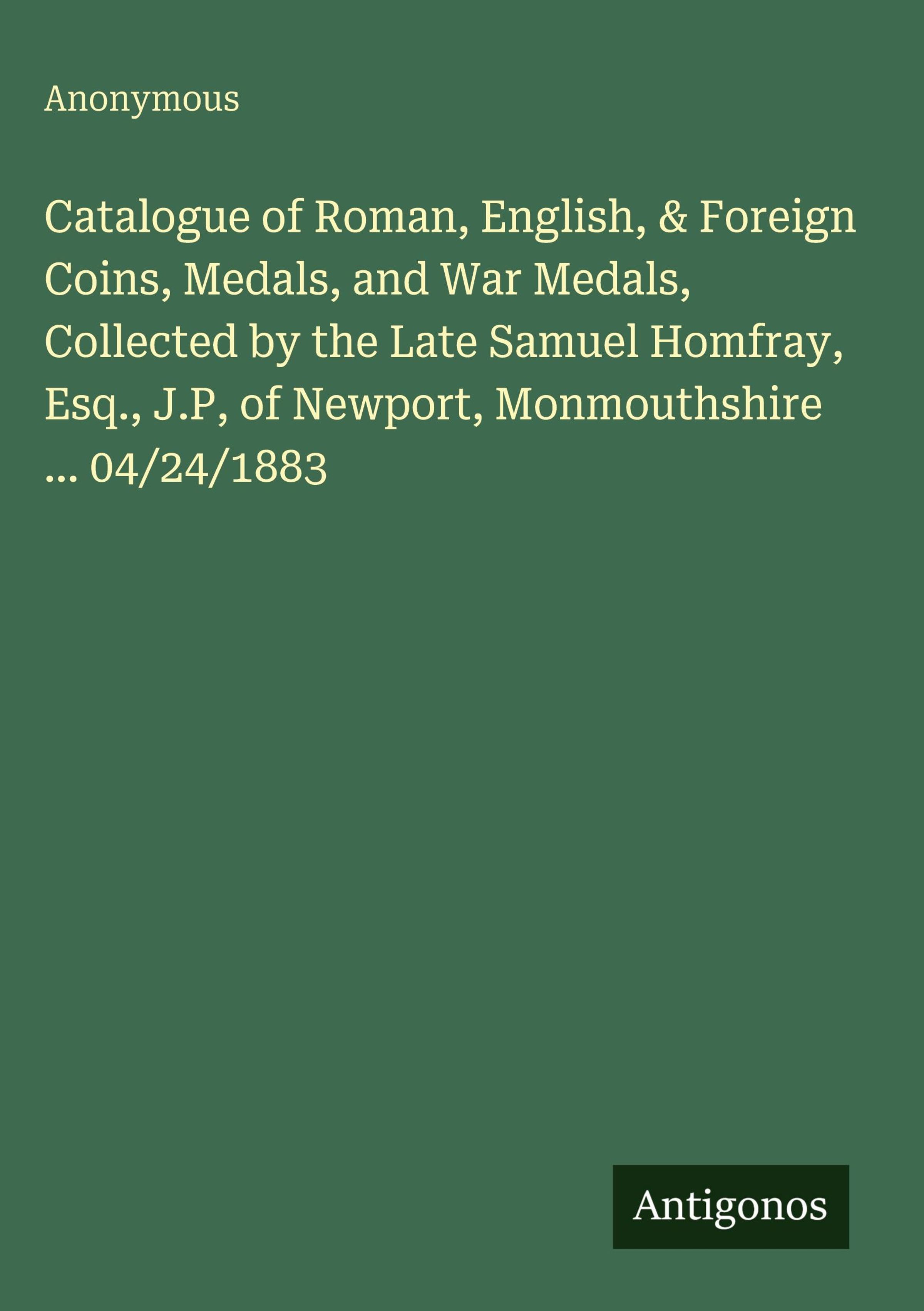 Catalogue of Roman, English, & Foreign Coins, Medals, and War Medals, Collected by the Late Samuel Homfray, Esq., J.P, of Newport, Monmouthshire ... 04/24/1883