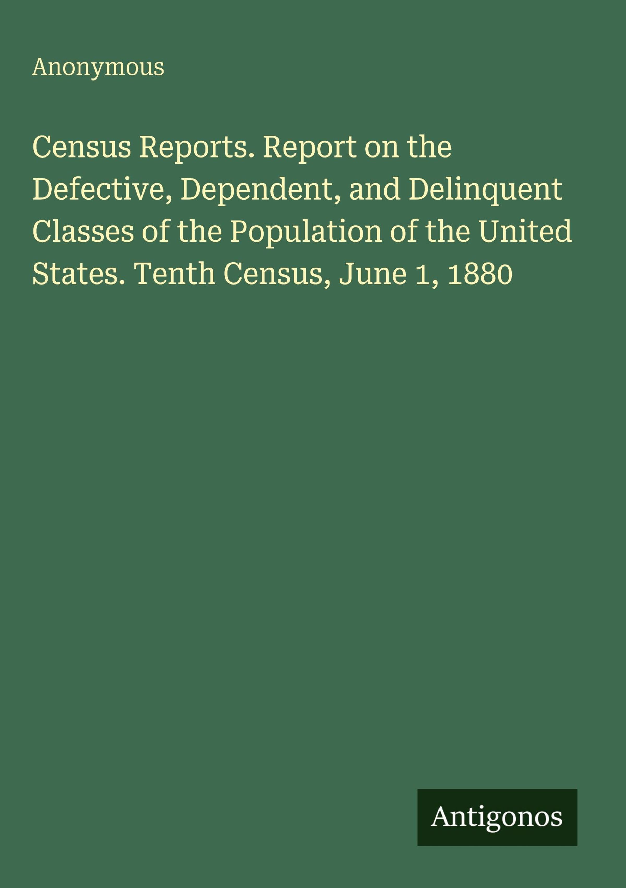Census Reports. Report on the Defective, Dependent, and Delinquent Classes of the Population of the United States. Tenth Census, June 1, 1880