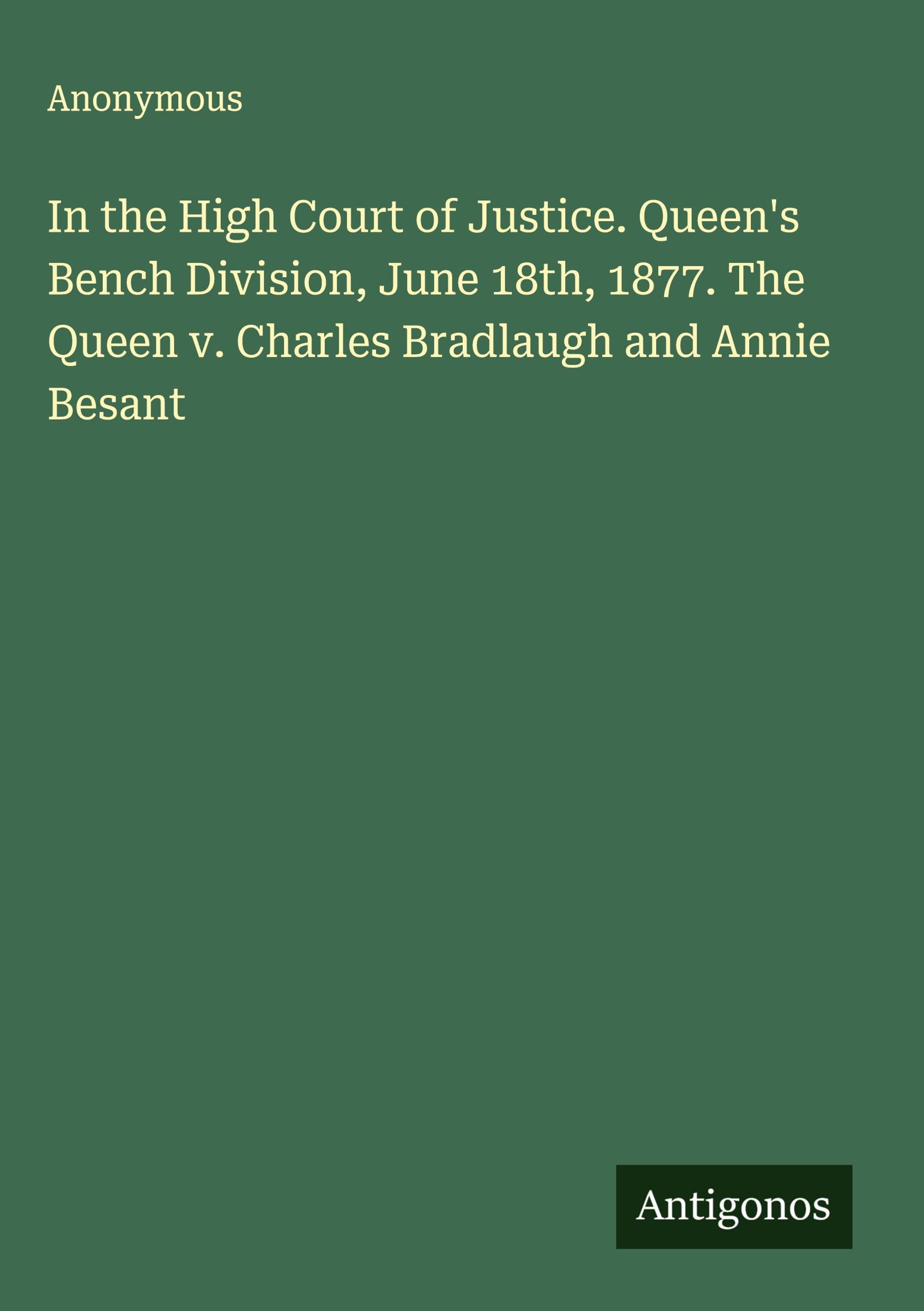 In the High Court of Justice. Queen's Bench Division, June 18th, 1877. The Queen v. Charles Bradlaugh and Annie Besant