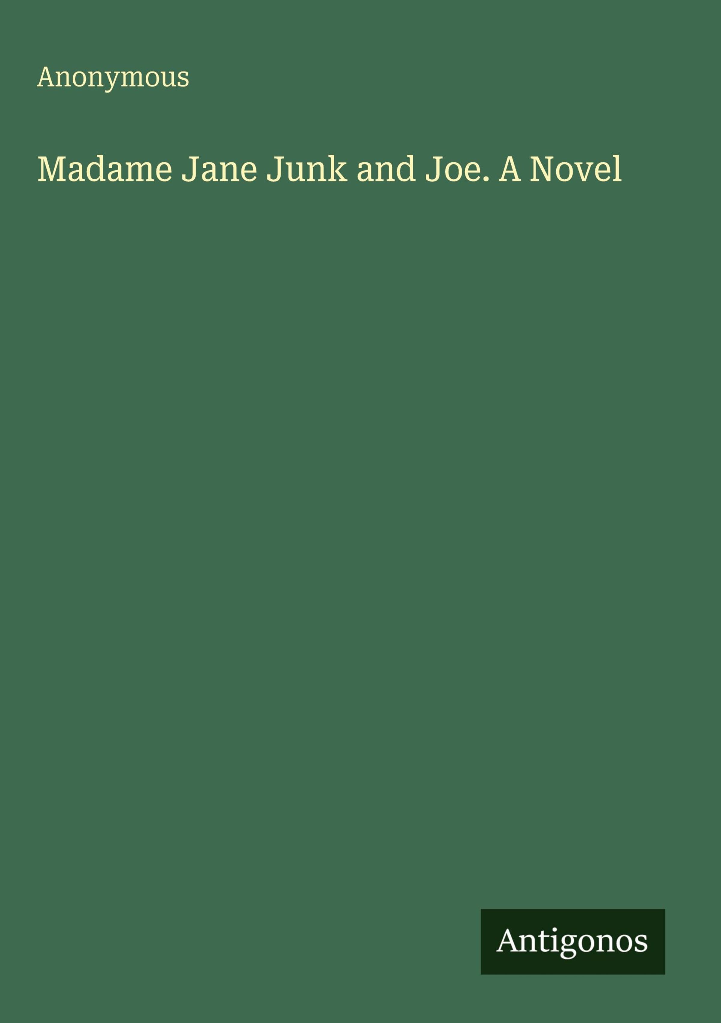 Text: "Anonymous. Madame Jane Junk and Joe. A Novel" und "Antigonos". Einfache grüne Fläche als Hintergrund., Buch