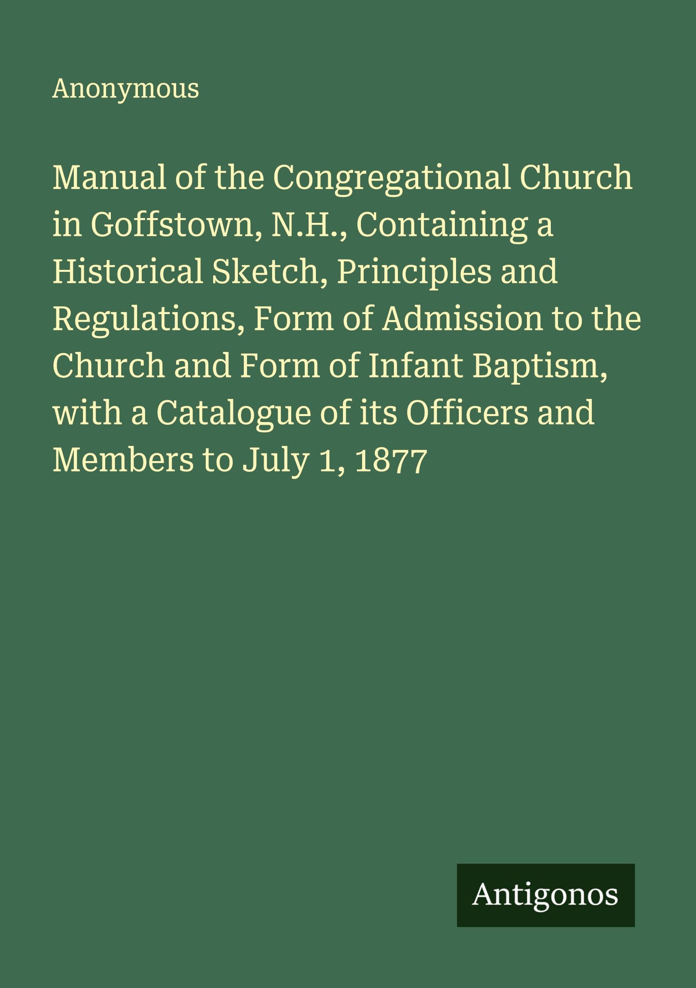 Manual of the Congregational Church in Goffstown, N.H., Containing a Historical Sketch, Principles and Regulations, Form of Admission to the Church and Form of Infant Baptism, with a Catalogue of its Officers and Members to July 1, 1877