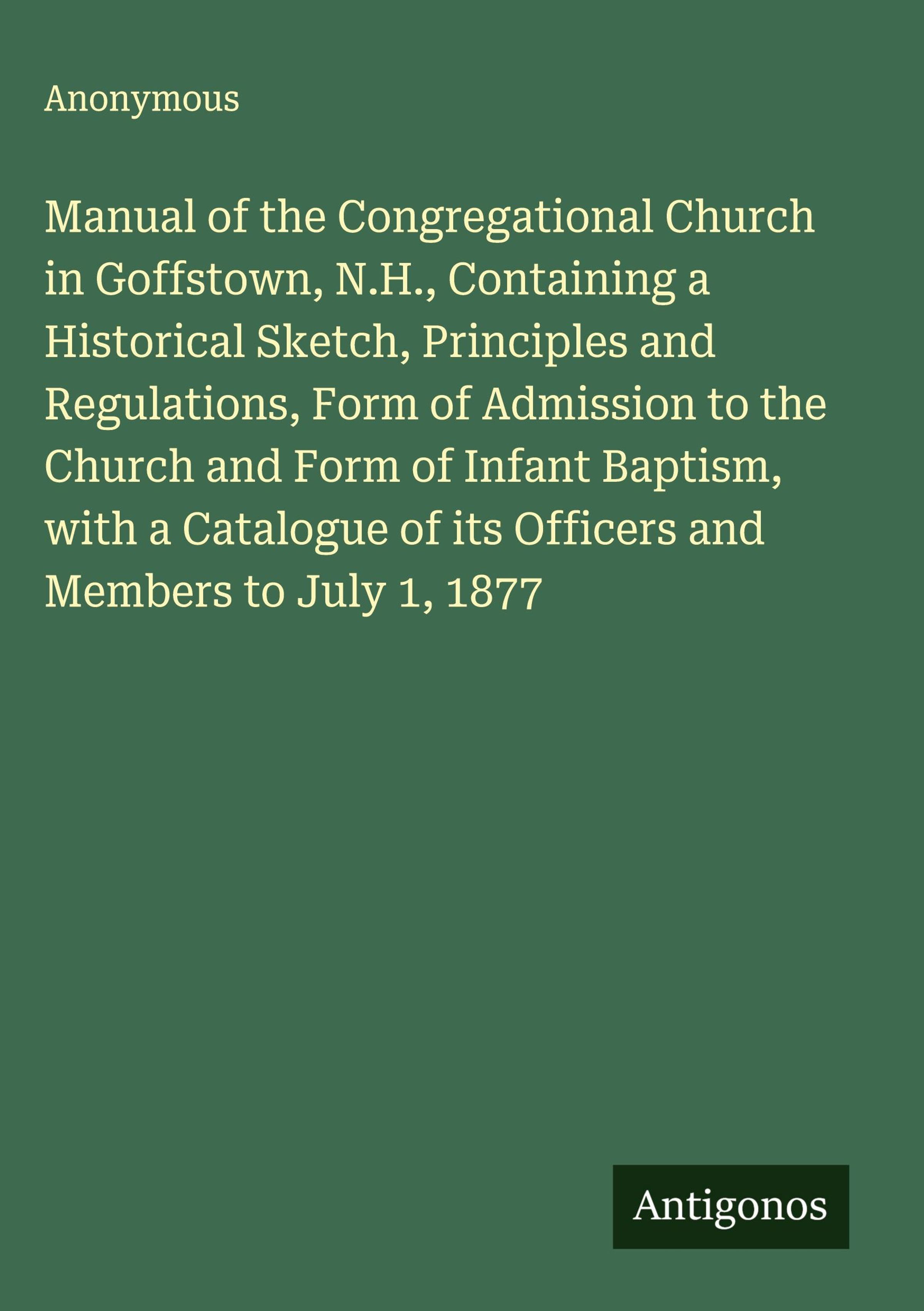 Manual of the Congregational Church in Goffstown, N.H., Containing a Historical Sketch, Principles and Regulations, Form of Admission to the Church and Form of Infant Baptism, with a Catalogue of its Officers and Members to July 1, 1877