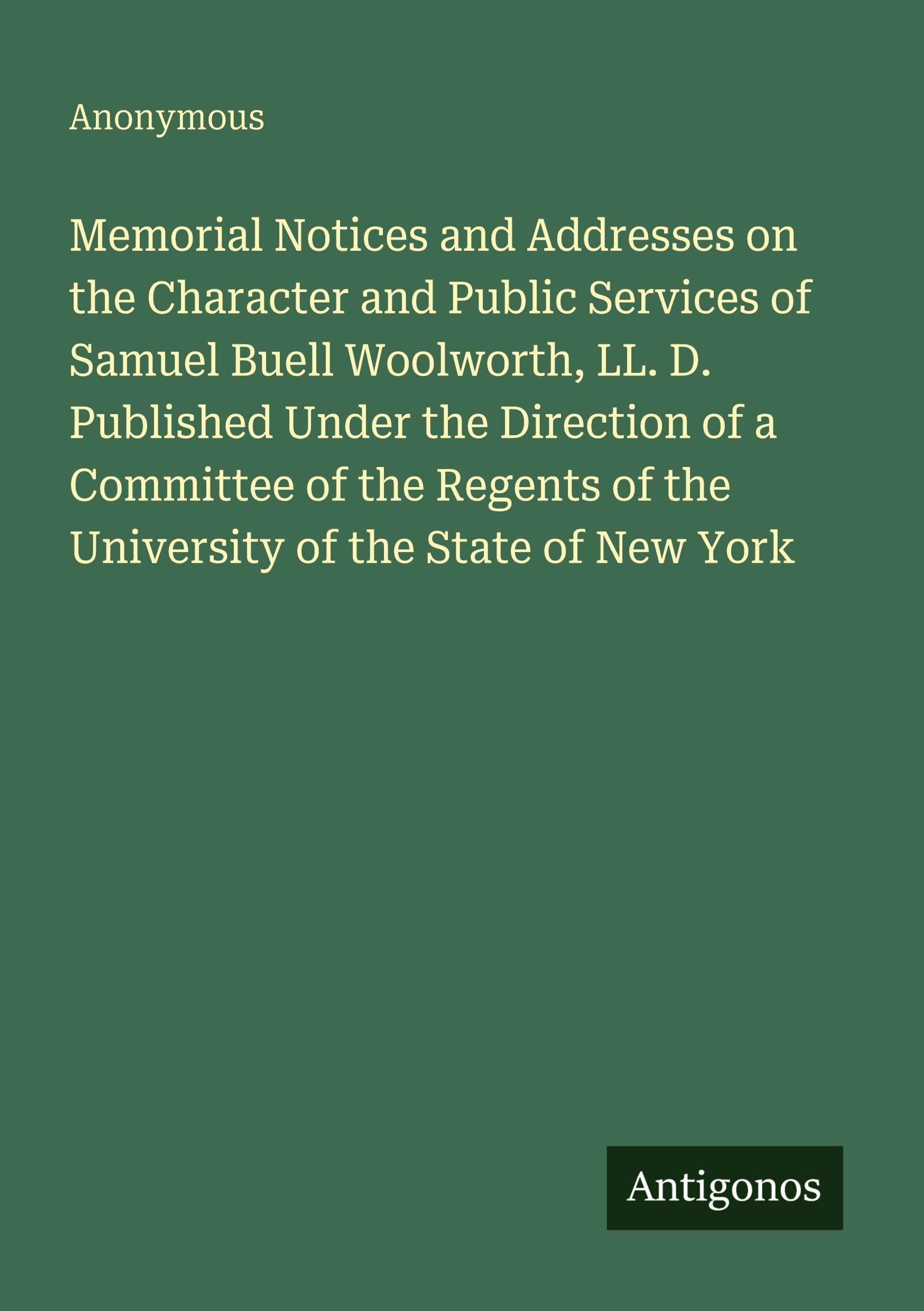 Memorial Notices and Addresses on the Character and Public Services of Samuel Buell Woolworth, LL. D. Published Under the Direction of a Committee of the Regents of the University of the State of New York