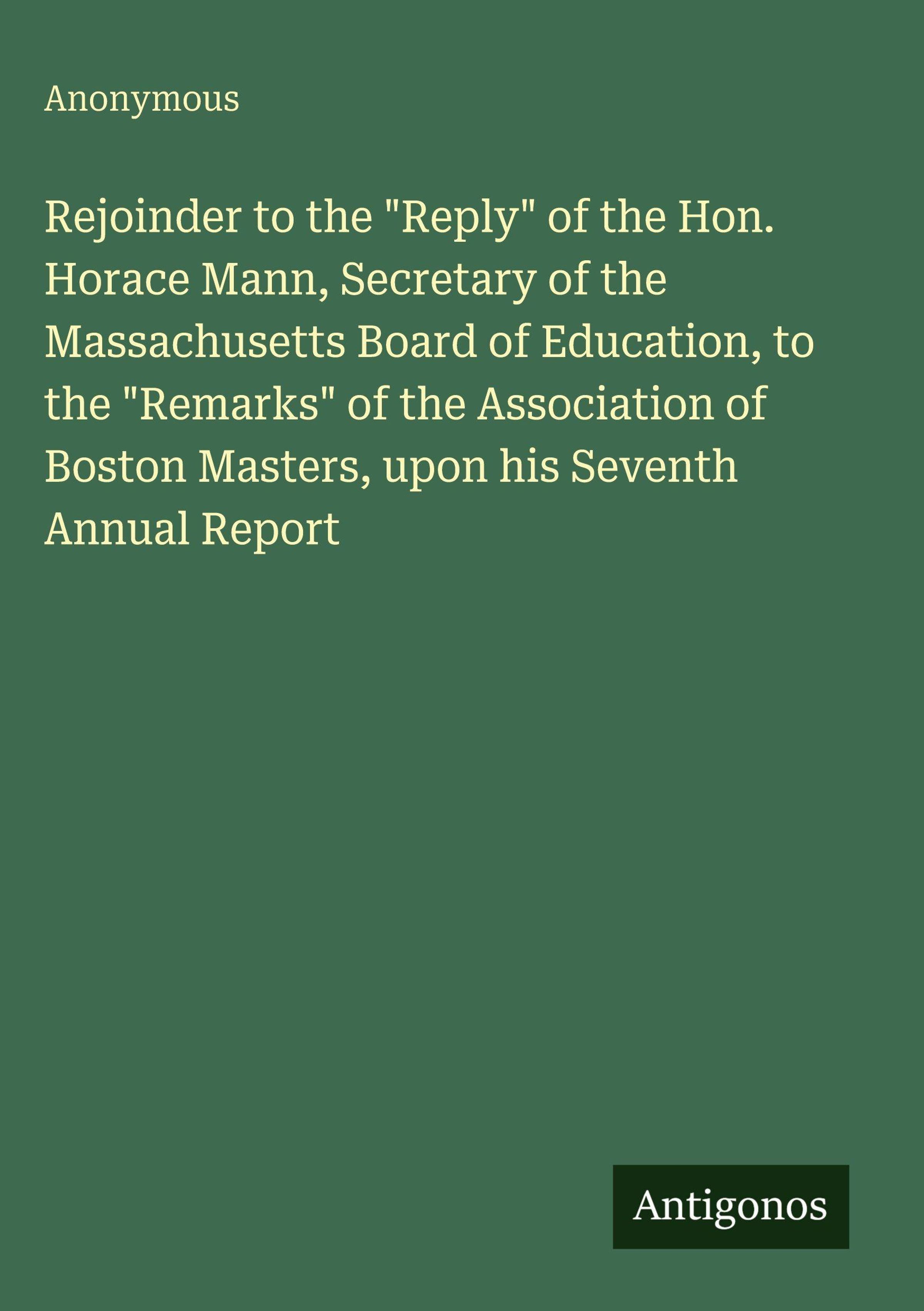 Anonymous: Rejoinder to the "Reply" of the Hon. Horace Mann, Secretary of the Massachusetts Board of Education,..., Gebunden