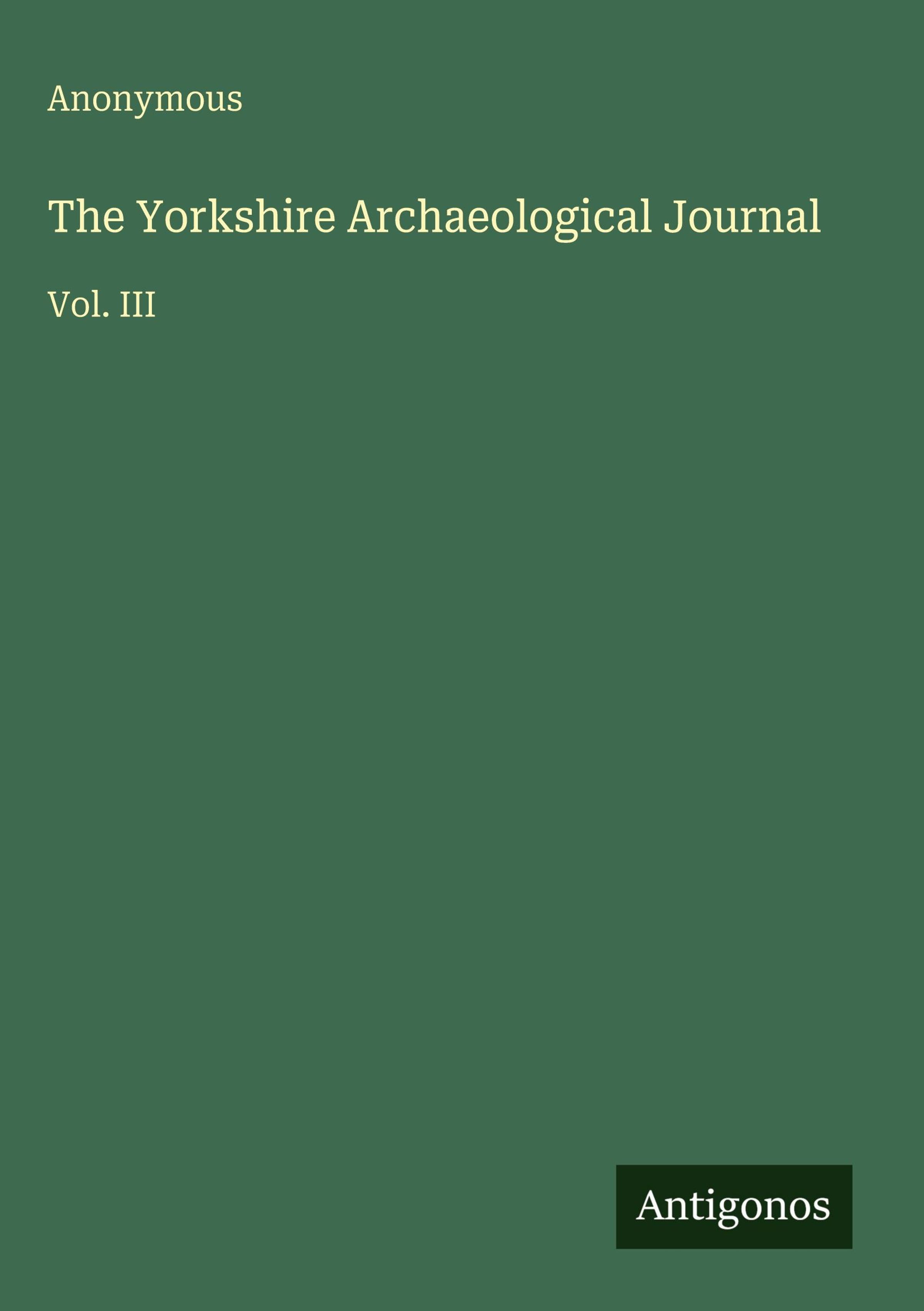 "Anonymous. The Yorkshire Archaeological Journal. Vol. III. Antigonos." Ein grünes Cover mit einem einfachen Design., Buch