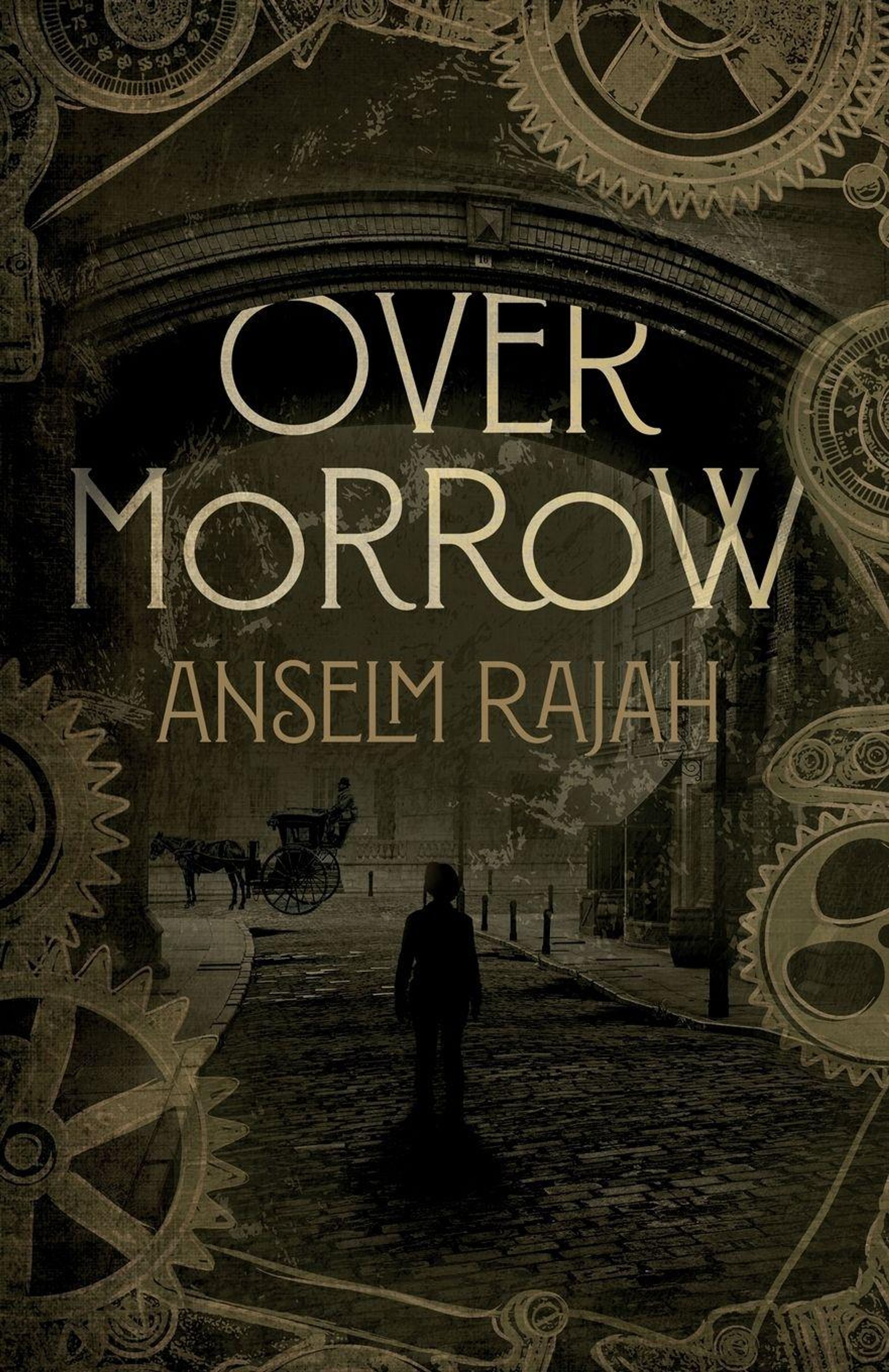 "OVERMORROW, ANSELM RAJAH." Illustration: Eine düstere Straße, Zahnräder und eine Kutsche im Hintergrund., Buch