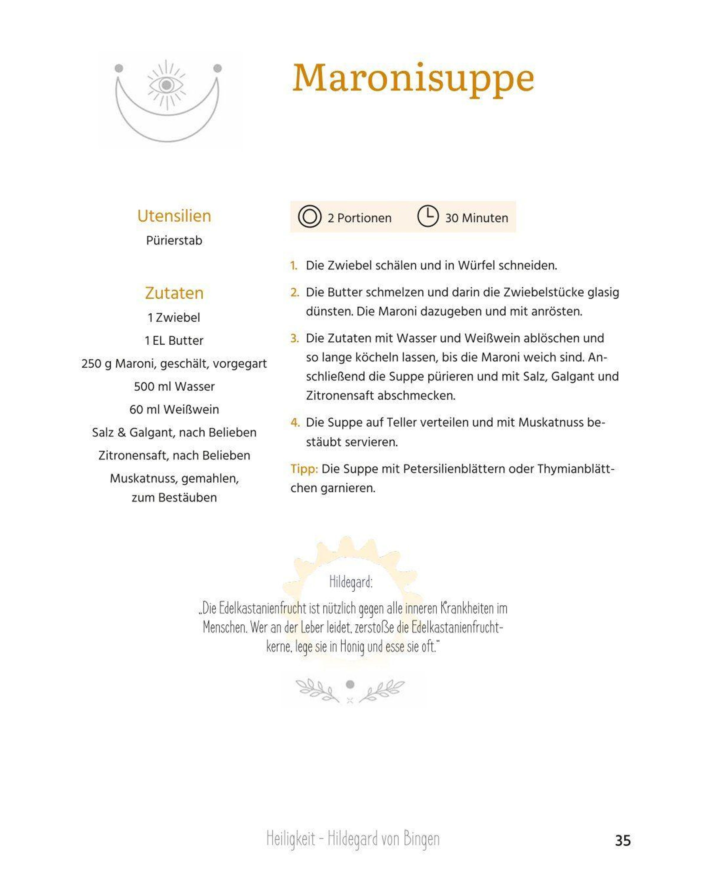 Die Rezepte sind unterteilt in sechs Kapitel: Im Kapitel "Ganzheitlichkeit" werden Rezepte mit Kräutern und Gewürzen für Körper und Geist vorgestellt. Im Kapitel "Heiligkeit" findest Du Rezepte nach dem Heilwissen von Hildegard von Bingen - von Brennnessel-Bärlauch-Suppe bis Quittenkompott. Die Rezepte aus dem Kapitel "Leibhaftigkeit" fördern Abwehrkräfte, Energie und Gesundheit - stärke Dein Immunsystem mit Goldener Milch, Ingwer-Shot oder Kamillen-Moonmilk. Das Kapitel "Wahrhaftigkeit" vermittelt Freude - durch Speisen wie Lamm-Eintopf mit Kichererbsen oder selbstgemachte Hühnerbrühe. Im Kapitel "Göttlichkeit" findest Du gesunde Speisen aus der Klosterküche - von Hirsebratlingen bis Kümmel-Ofenkartoffeln. Abgerundet wird das Buch durch das Kapitel "Seligkeit" mit himmlischen Backrezepten von Urkornbrot bis Dinkel-Pancakes.