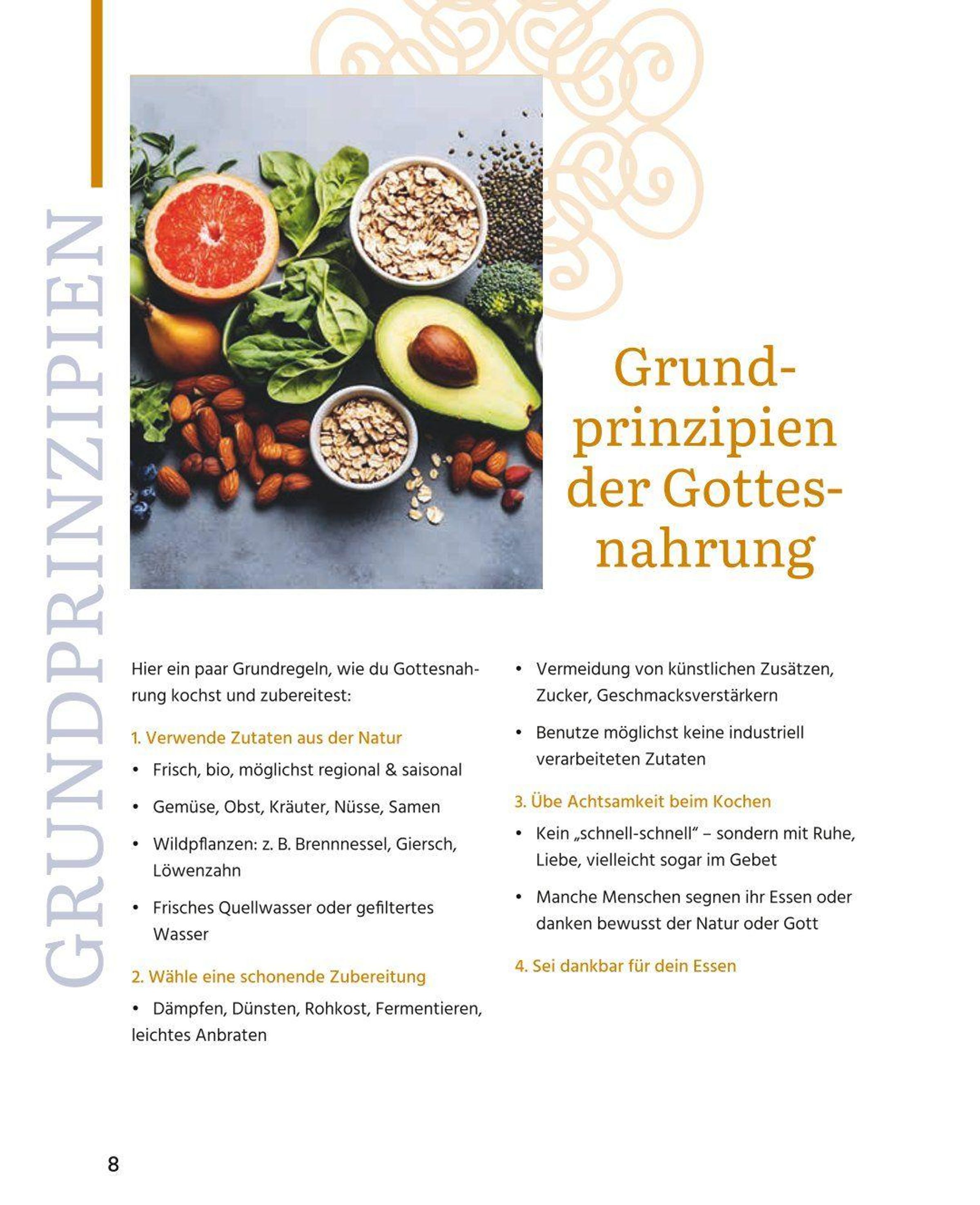 Gottesnahrung ist eine Reise zurück zur lebendigen Nahrung; zu reinen, möglichst unverarbeiteten und natürlichen Lebensmitteln. Zu einer Ernährung, die sich in Balance mit Körper und Natur befindet und zu deren Pfeilern Achtsamkeit, Saisonalität und Regionalität gehören. In jedem Fall ist es für uns eine natürliche, gesunde und "ehrliche" Art zu kochen, - auch im Sinne von Dankbarkeit gegenüber der Schöpfung oder der Natur. In einer Welt, in der Geschwindigkeit, Industrialisierung und Konsum das tägliche Leben prägen, lädt dieses Buch dich ein, einen Schritt zurückzutreten - zurück zur Einfachheit. Die Gerichte sind leicht zuzubereiten, gesund und lecker und vermitteln als wichtige Zutat Dankbarkeit, Spiritualität und Freude am Essen. Besonders wertvoll sind die Erklärungen zur ganzheitlichen Wirkung der Zutaten.