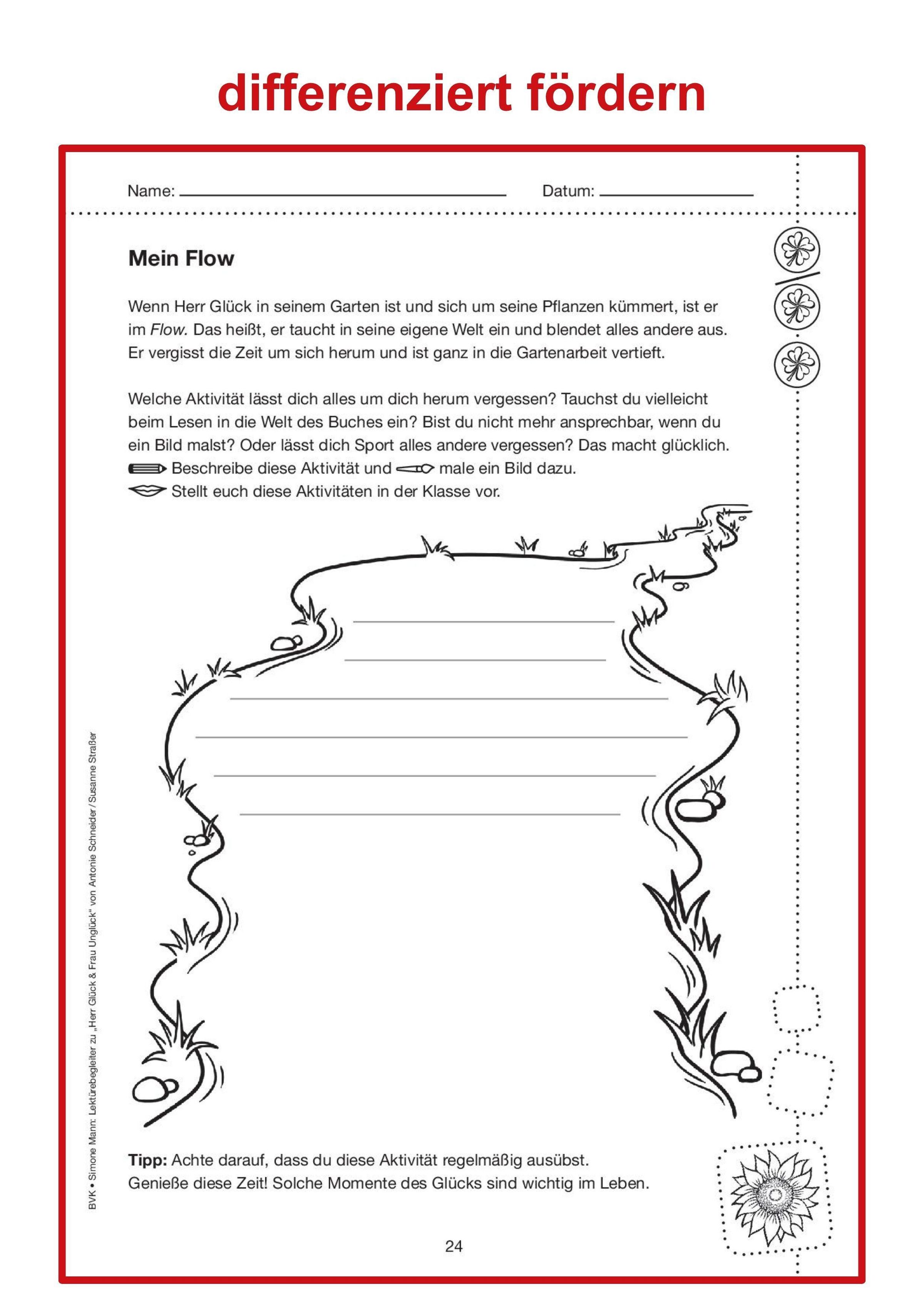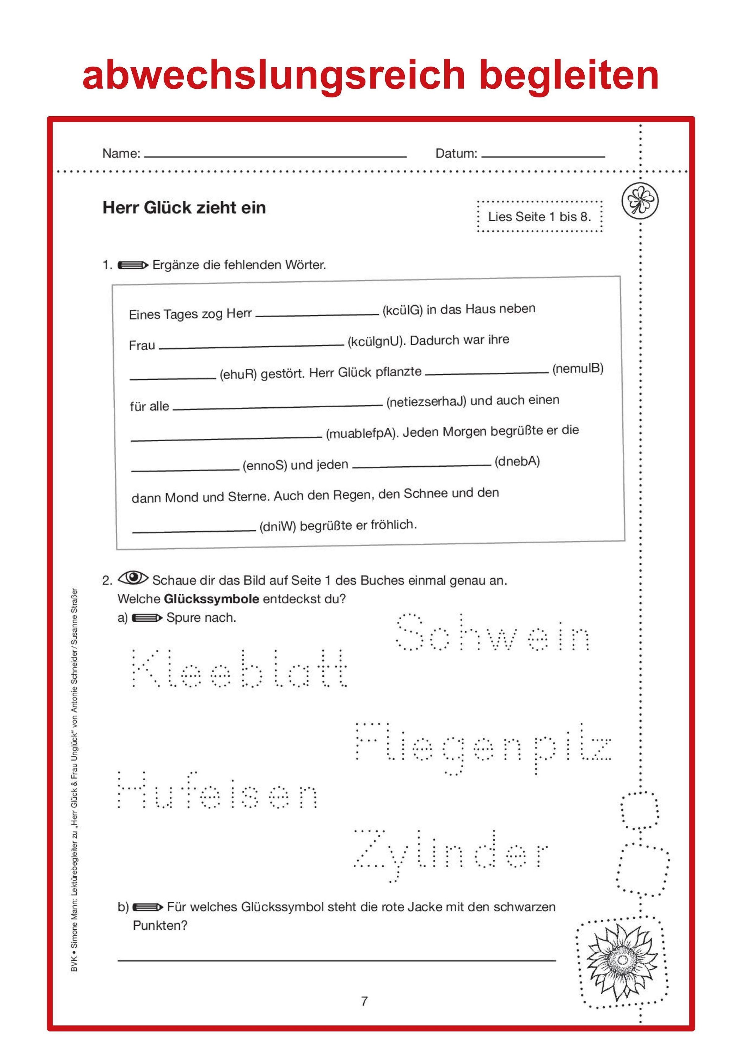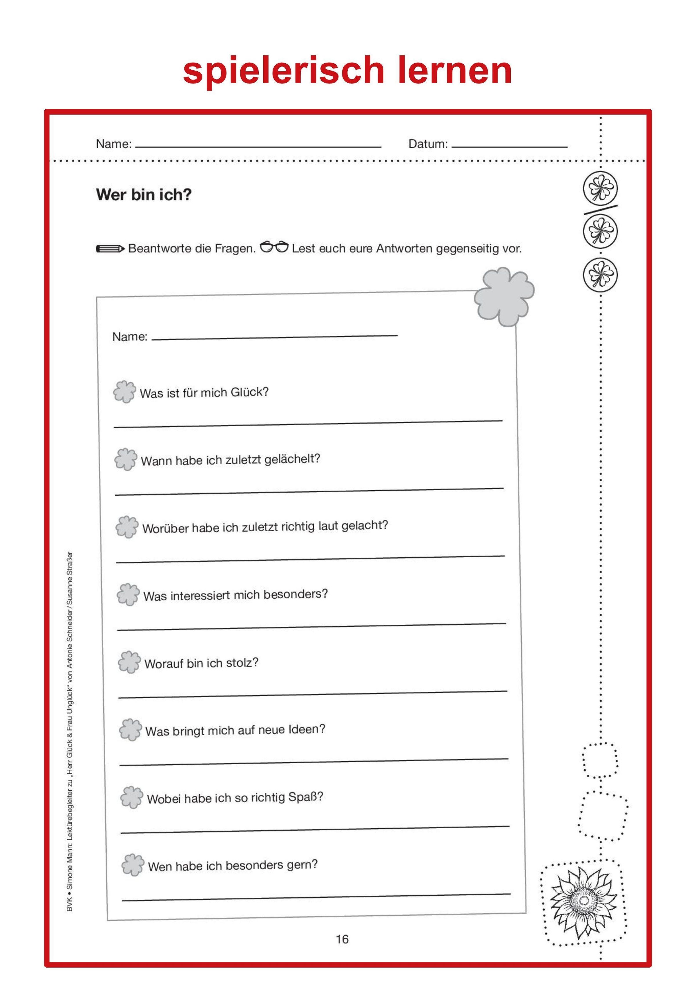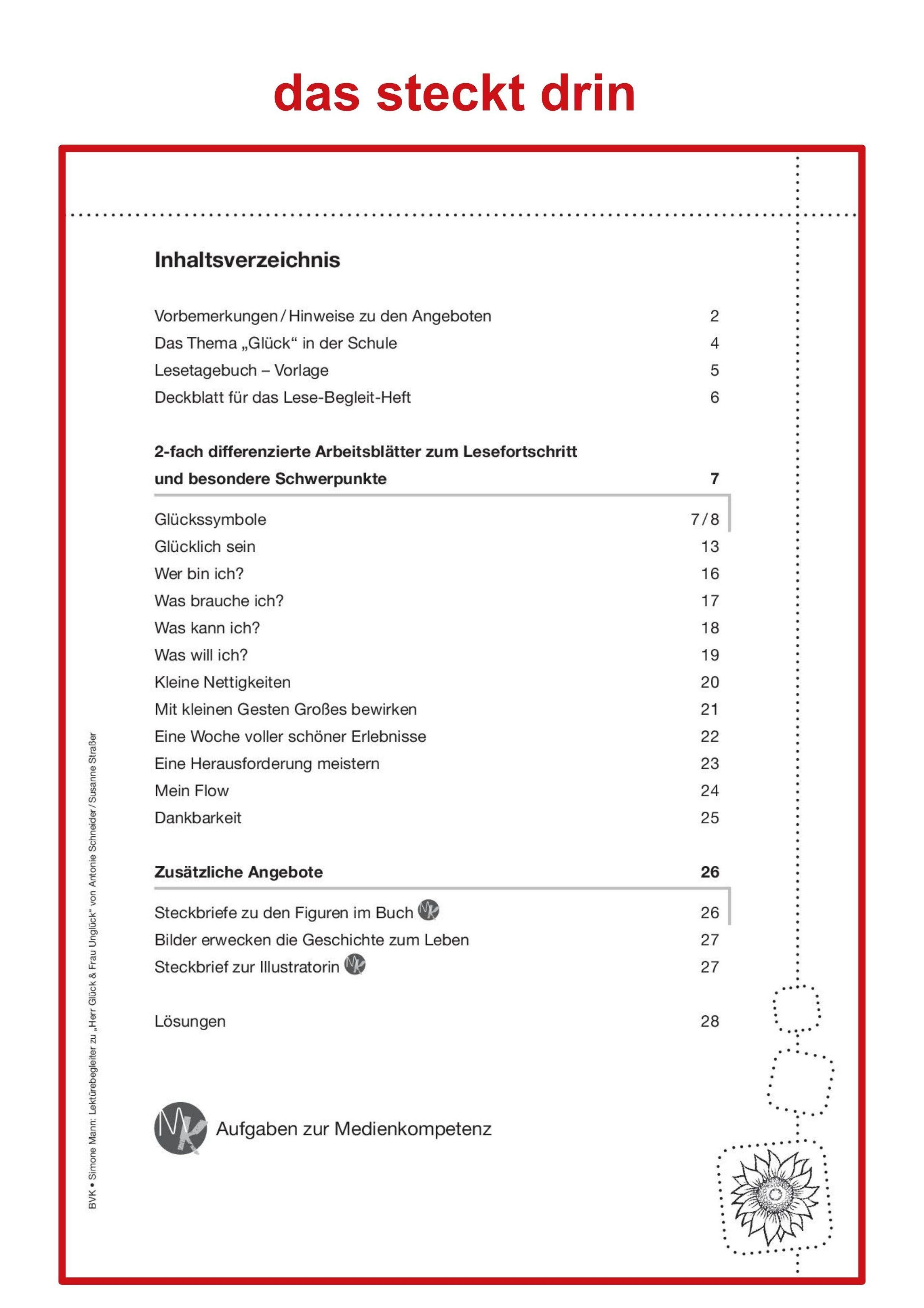 Der Lektürebegleiter bietet zweifach differenzierte Arbeitsblätter zum Lesefortschritt. Das zentrale Thema des Buches, nämlich "Glück", wird im Anschluss noch einmal umfassend behandelt. Passend zum Schulfach "Glück" regen die Aufgaben die Kinder dazu an, ihr eigenes Glücksempfinden zu reflektieren und zu hinterfragen. Dabei werden Fragen beantwortet wie "Was macht mich glücklich?", "Was sind meine Stärken?" und "Was will ich im Leben erreichen?".