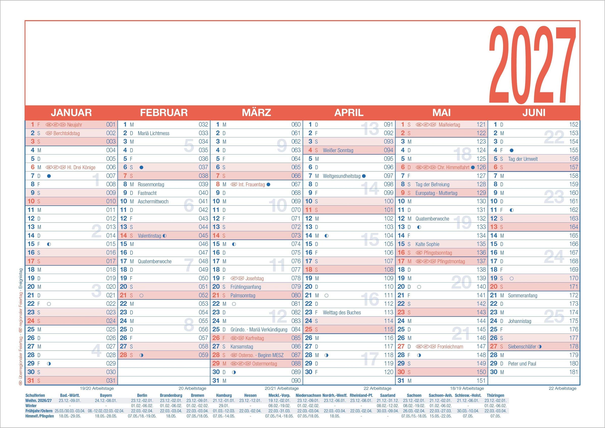 Strukturierte Planung: Mit Arbeitstage-, Tages- und Wochenzählung, ergänzt durch Ferienübersicht und Mondphasen