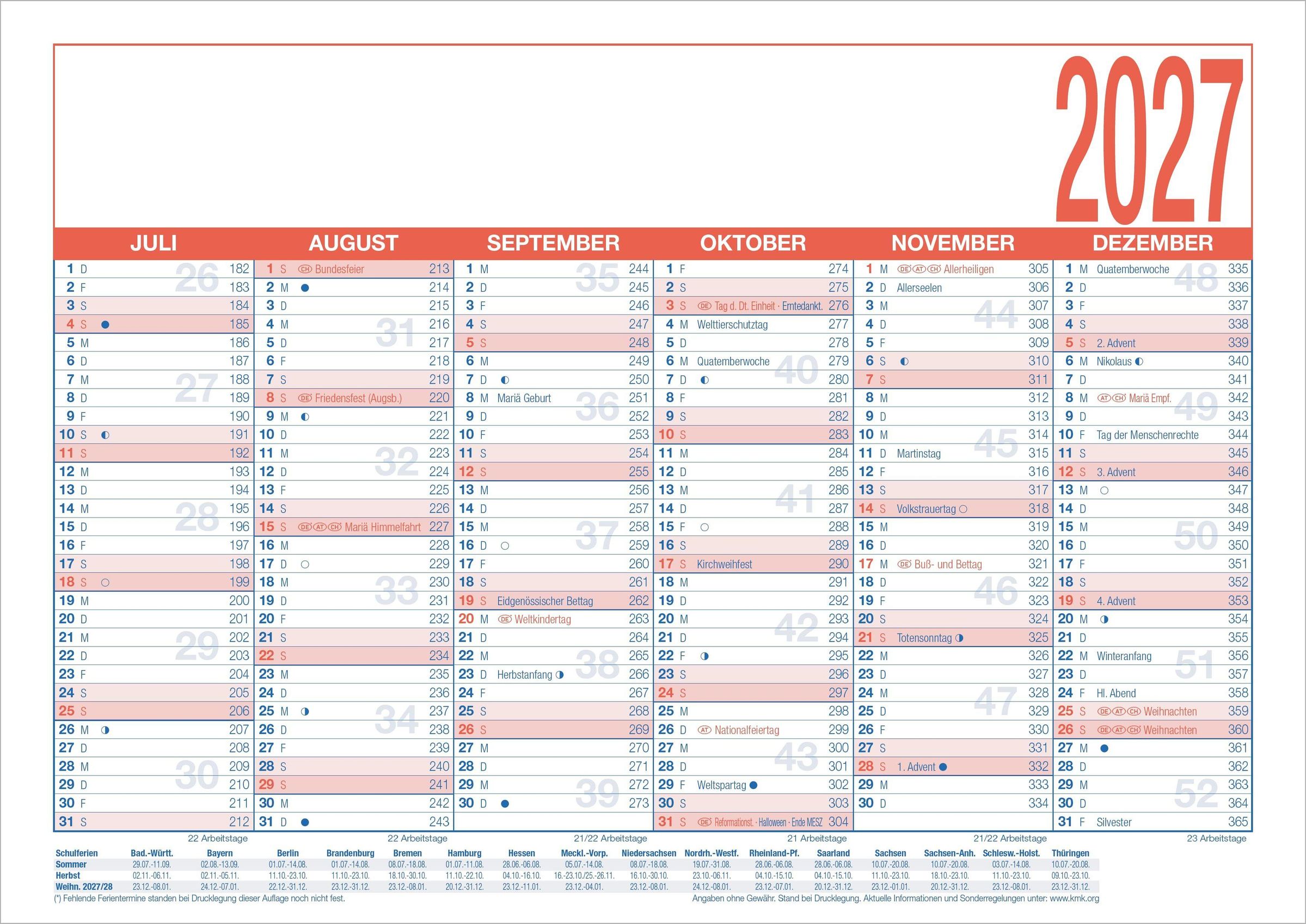 Praktische Details: Wochenenden und Feiertage in Rot hervorgehoben, zusätzlicher Notizbereich oberhalb des Kalendariums