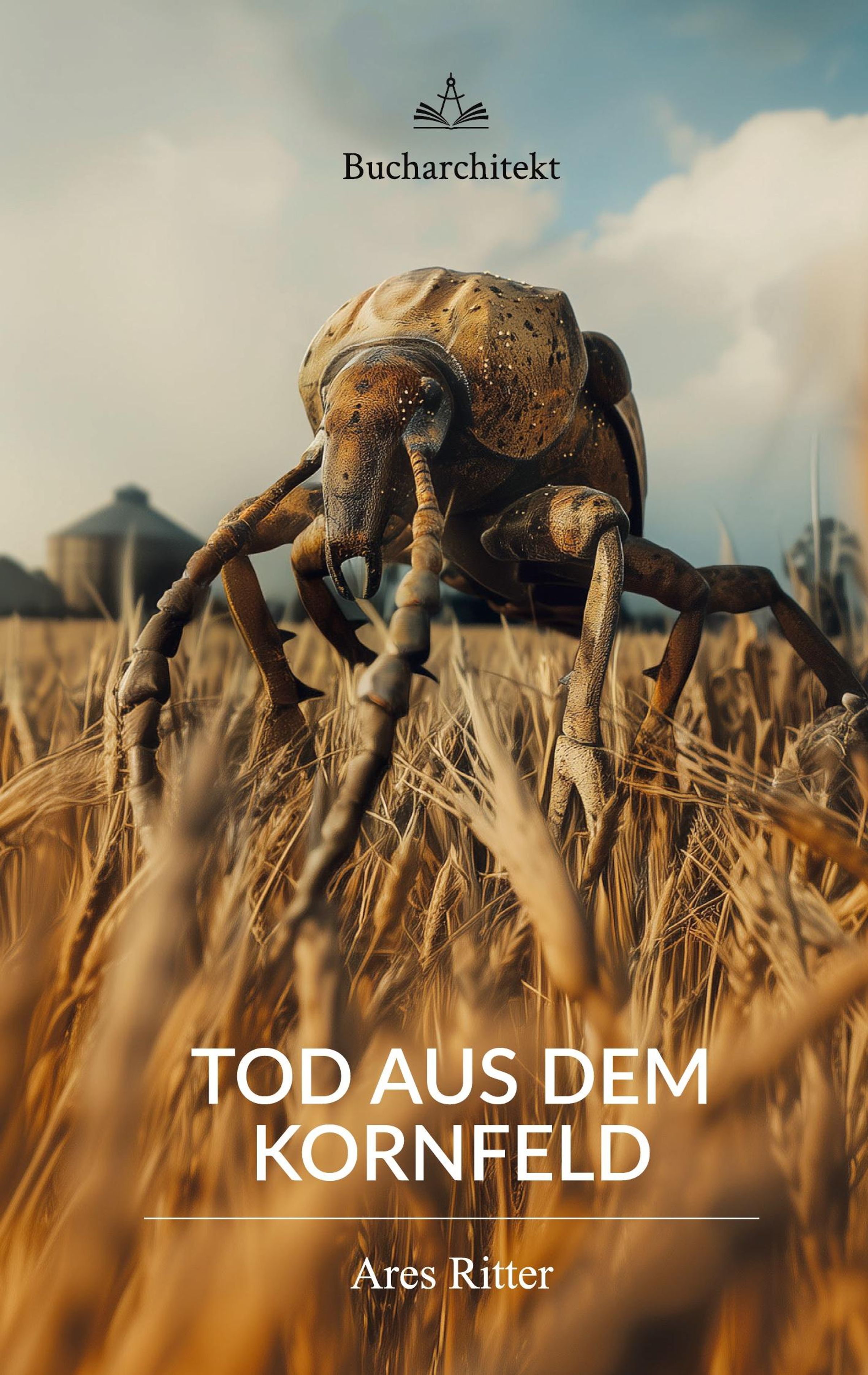 "TOD AUS DEM KORNFELD, Ares Ritter." Ein Käfer kriecht durch ein Kornfeld, darunter Logo "Bucharchitekt"., Buch