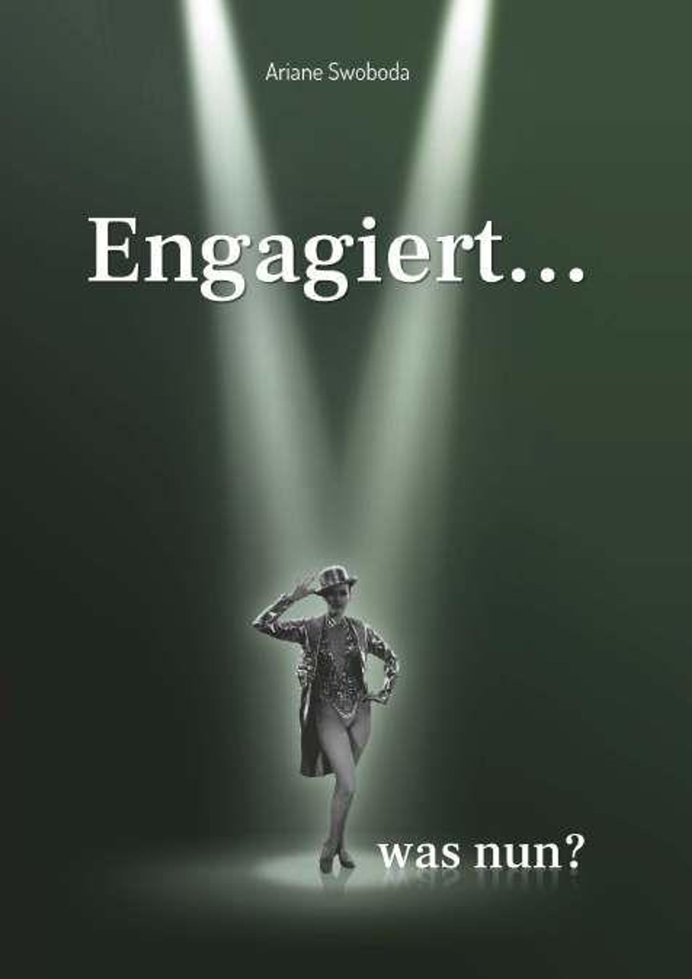 Oben steht "Ariane Swoboda". "Engagiert... was nun?" Ein Tänzer in Kostüm und Hut im Scheinwerferlicht., Buch