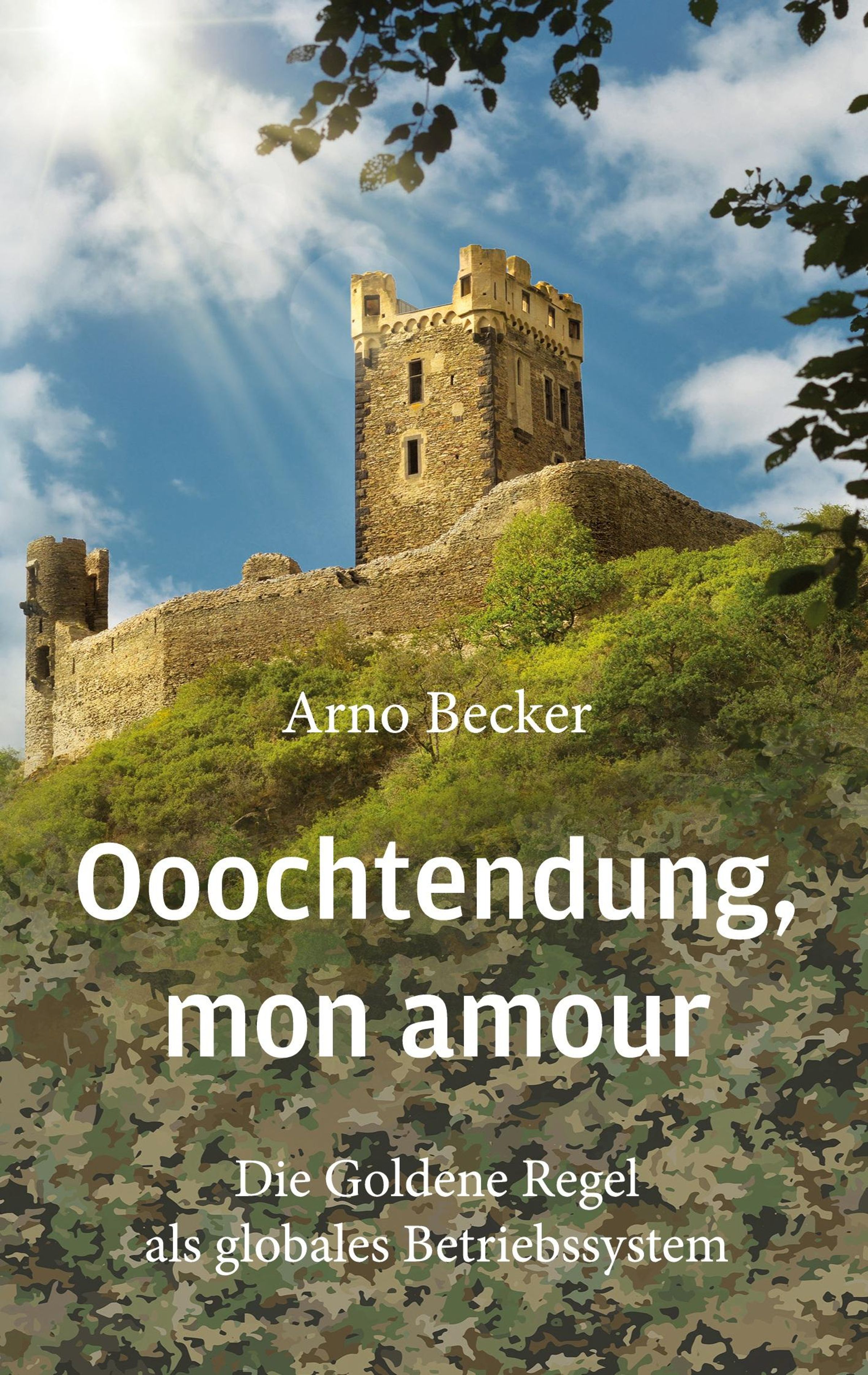 Text: „Arno Becker, Oochtendung, mon amour, Die Goldene Regel als globales Betriebssystem.“ Eine Burg vor blauem Himmel., Buch