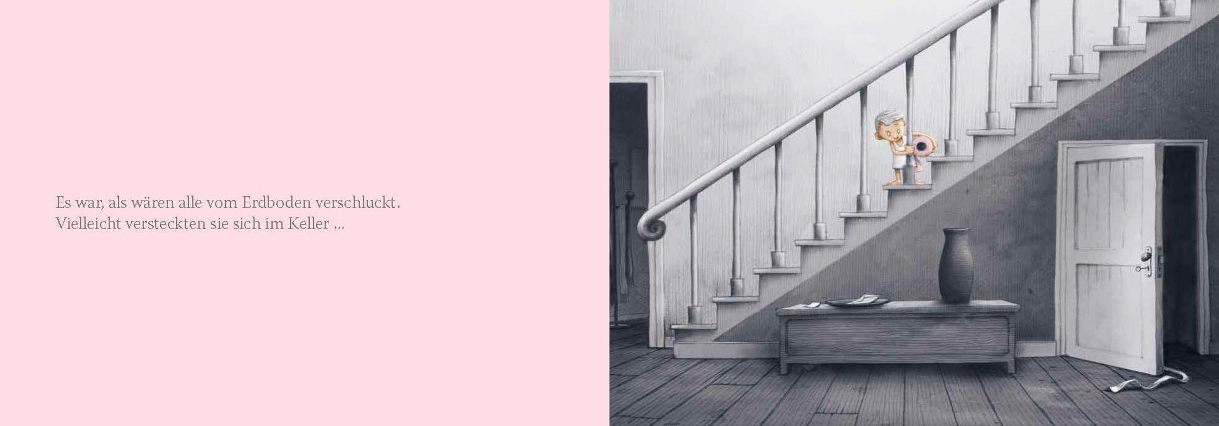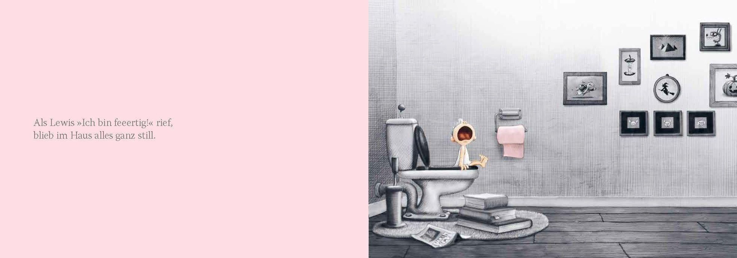 'Ich bin feeertig!', ruft der kleine Lewis von seinem großen Thron, doch niemand kommt. Also macht er sich, bewaffnet mit einer flatternden Rolle rosa Klopapier, auf die Suche durch das ganze Haus - und weiter. Vom Dachboden bis in den Keller, vom Garten bis in märchenhafte Welten trifft er auf gruselige, lustige und heldenhafte Gestalten, die wir alle kennen: Hexen, Skelette, Oger, die drei kleinen Schweinchen und sogar Batman. Doch so mutig diese Figuren sonst auch sein mögen - wenn es darum geht, Lewis abzuwischen, halten sie sich lieber diskret versteckt! Mit witzigen Anspielungen auf Märchen, Mythen und Comics bietet dieses Bilderbuch viele versteckte Details, die Kinder entdecken können und Erwachsene schmunzeln lassen. Am Ende entpuppt sich alles als Traum und Mama steht da, um Lewis zur Hilfe zu eilen. Dabei ist er doch noch längst nicht fertig!