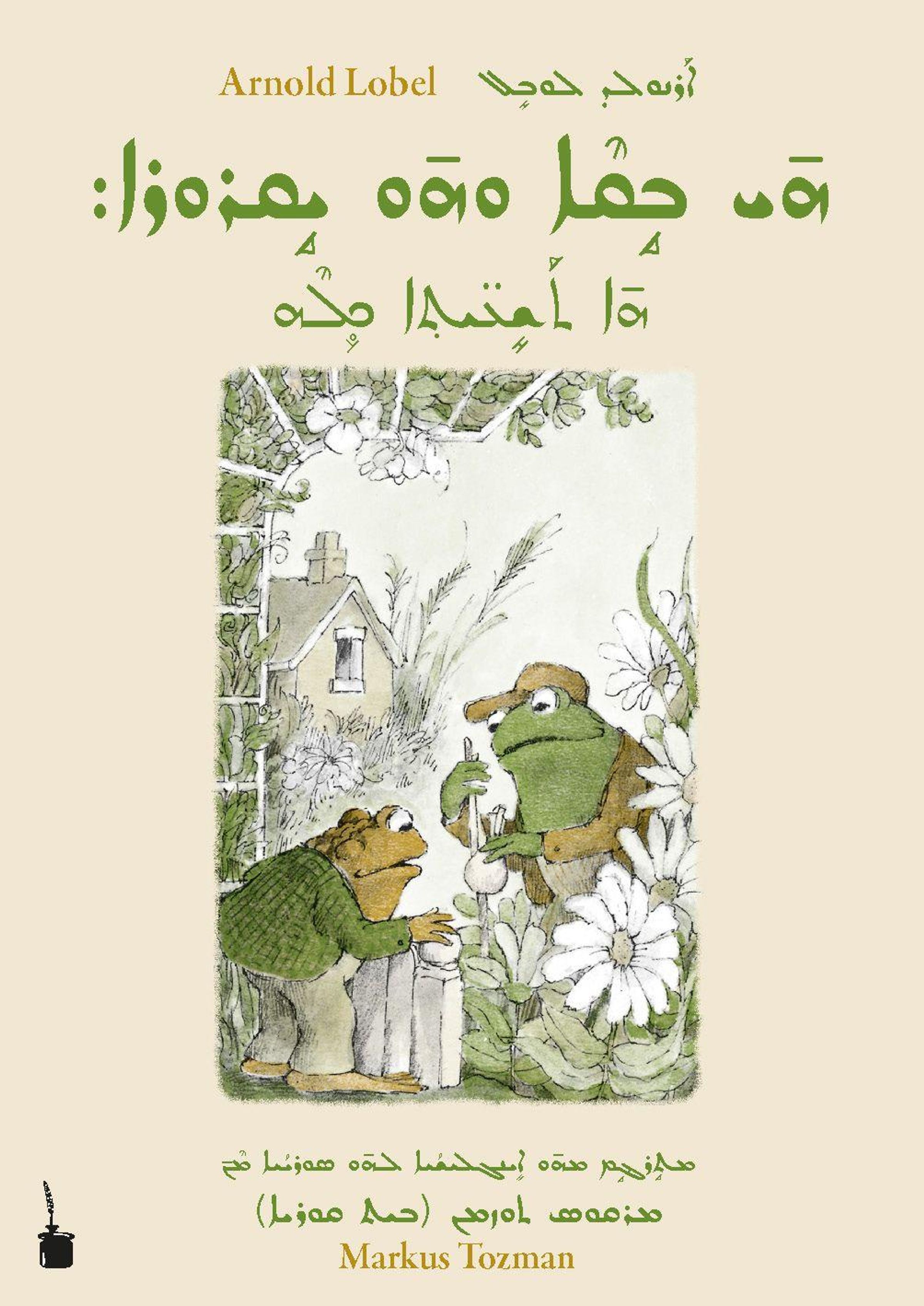 Arabische und lateinische Schrift. Zwei Frösche in Kleidung im Garten. Illustration in sanften Farben., Buch