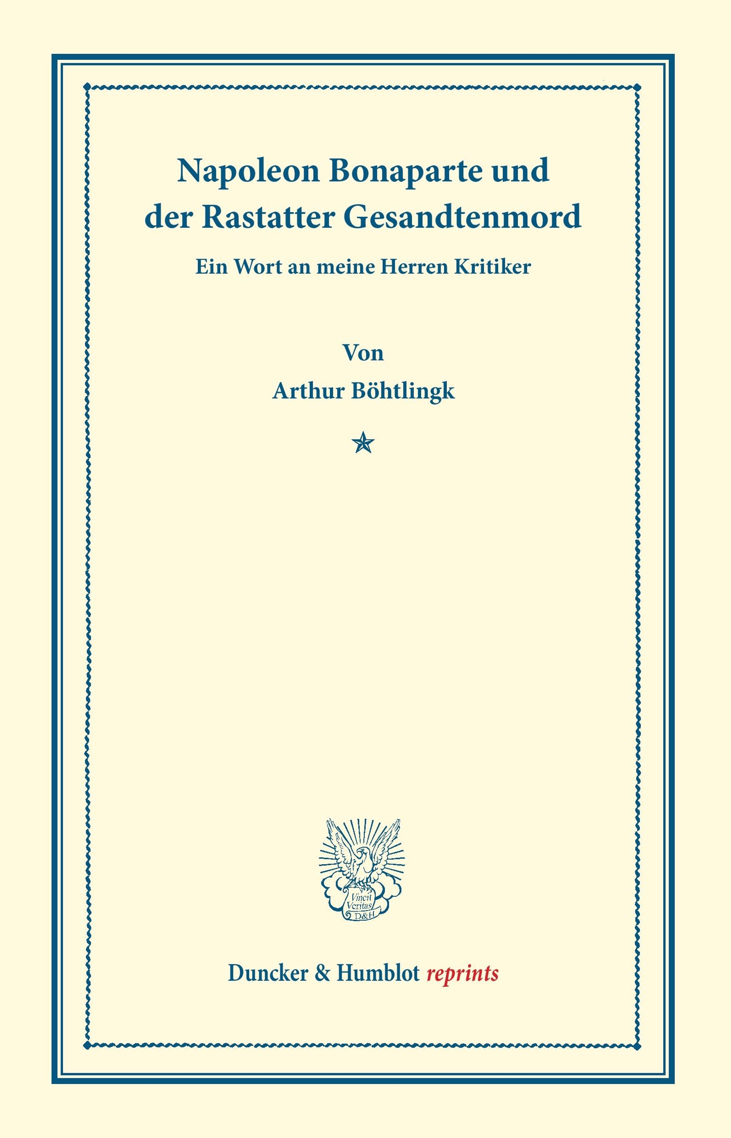 Der Rastatter Gesandtenmord an zwei französische Diplomaten in der Nacht des 29. April 1799 beendete die Friedensbemühungen zwischen Frankreich und Österreich. Der Historiker Arthur Heinrich Böhtlingk (1849¿1929) rekapituliert in seiner Arbeit aus dem Jahr 1883 die früheren Thesen zum Tathergang und stellt eine eigene >>verwegene Hypothese<< (S. 27) auf, die Napoleon Bonaparte ins Zentrum des Mordkomplottes rückt. Bis heute konnte der Gesandtenmord allerdings nicht aufgeklärt werden.