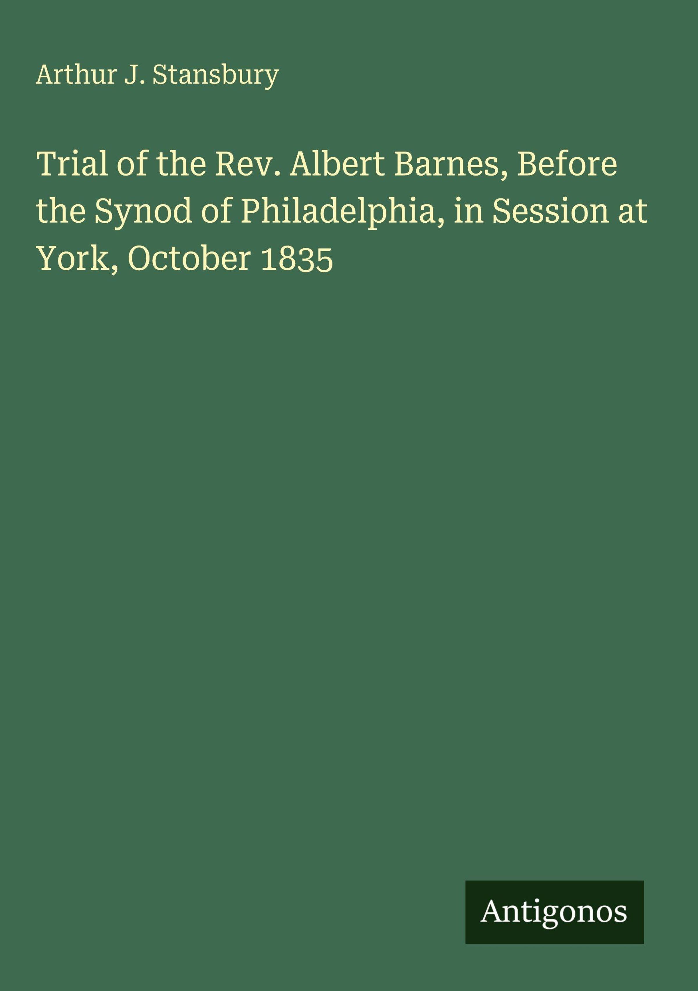 Arthur J. Stansbury: Trial of the Rev. Albert Barnes, Before the Synod of Philadelphia, in Session at York,..., Gebunden