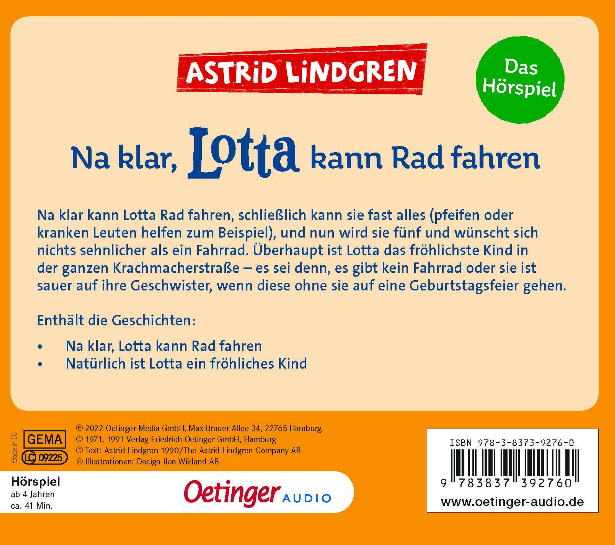 Na klar kann Lotta Rad fahren, schließlich kann sie fast alles (pfeifen oder kranken Leuten helfen zum Beispiel), und nun wird sie fünf und wünscht sich nichts sehnlicher als ein Fahrrad. Überhaupt ist Lotta das fröhlichste Kind in der ganzen Krachmacherstraße - es sei denn, es gibt kein Fahrrad oder sie ist sauer auf ihre Geschwister. Lotta ist eine der hinreißendsten Kinderbuchheldinnen von Astrid Lindgren. Diese moderne Neuinszenierung für alte und neue Lotta-Fans enthält die Geschichten 'Na klar, Lotta kann Rad fahren' und 'Natürlich ist Lotta ein fröhliches Kind'.