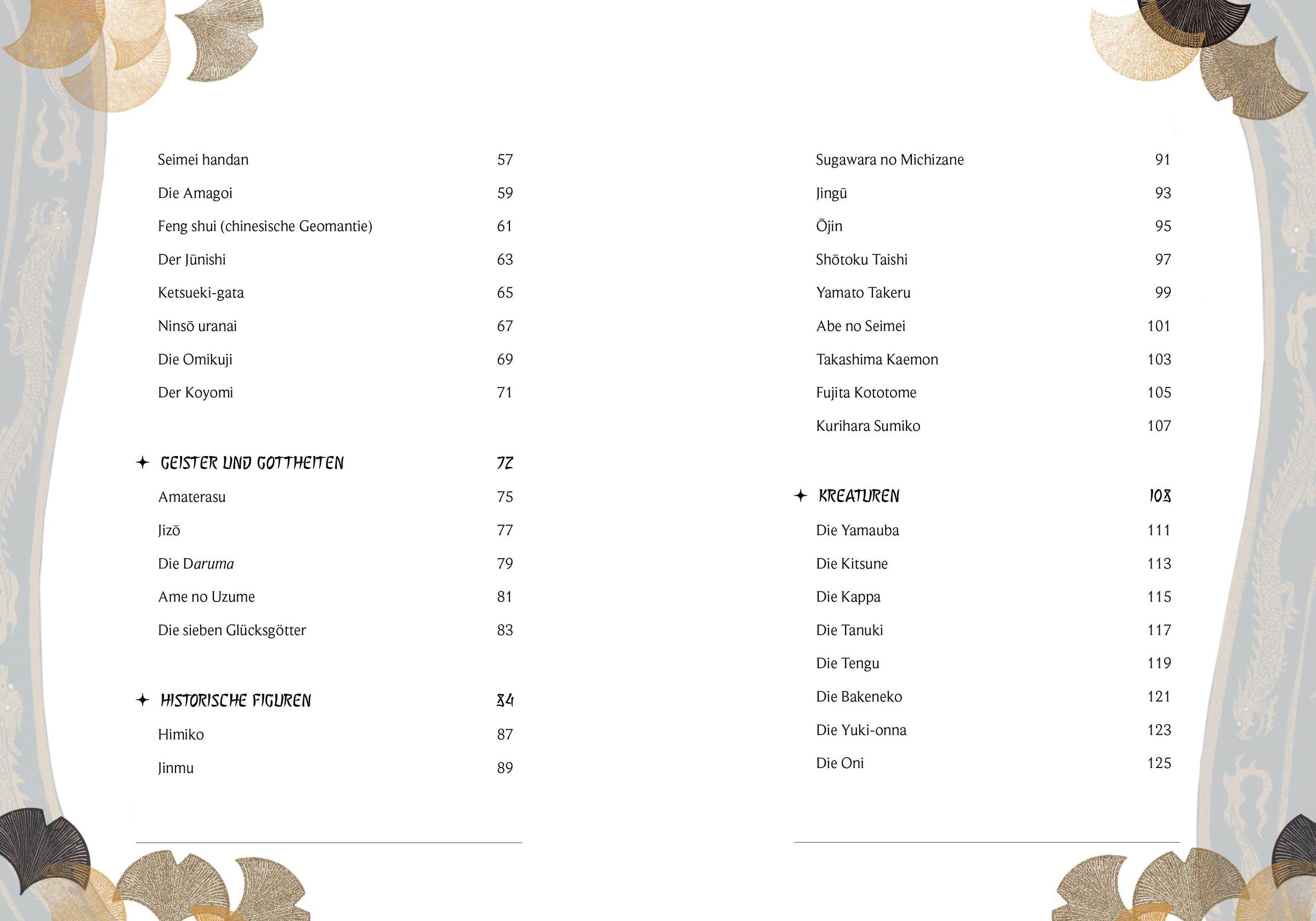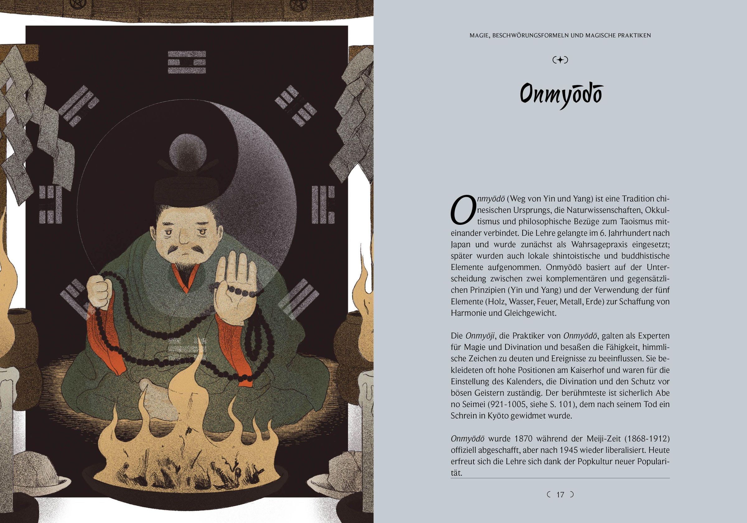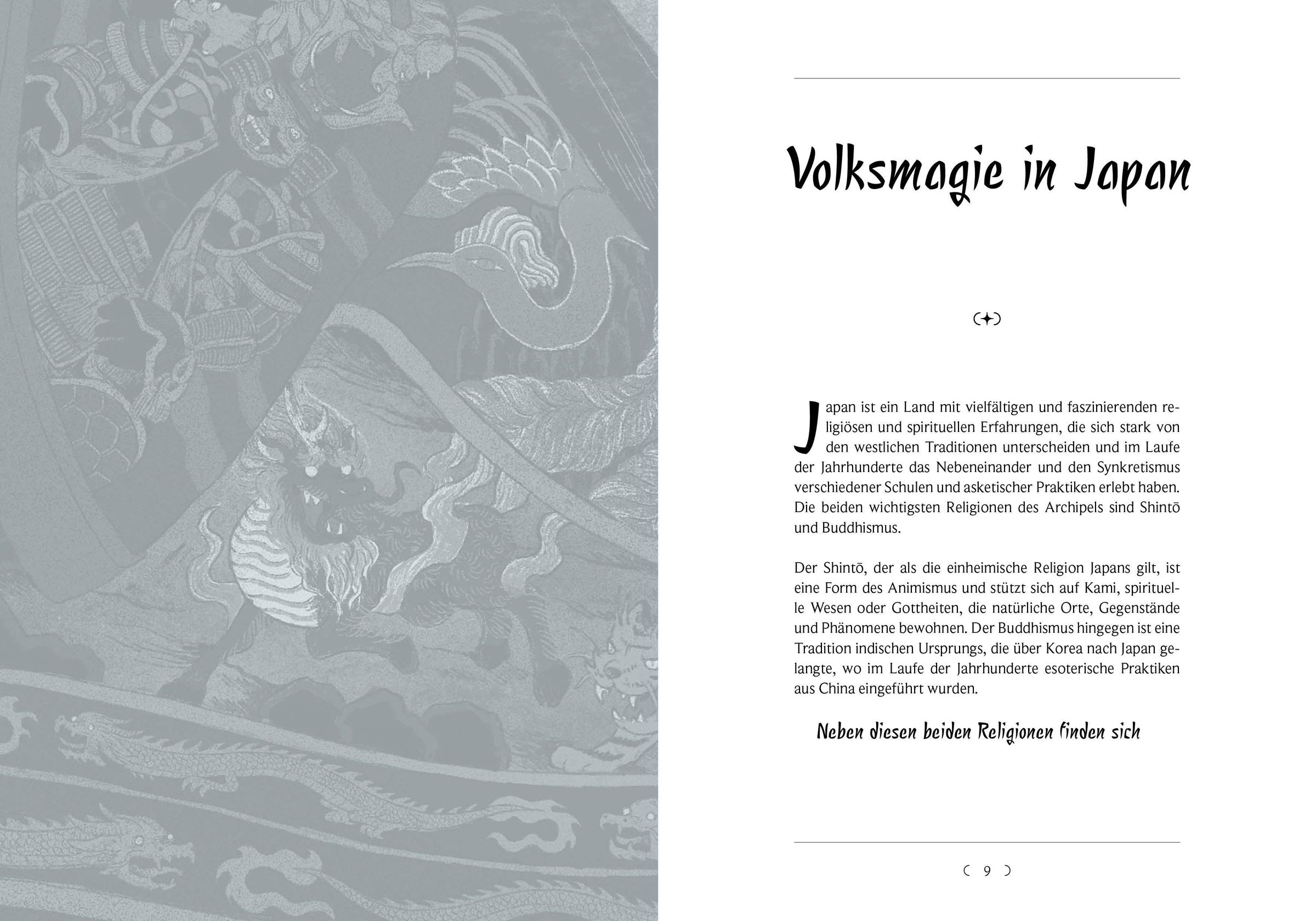 "Japan, Magie & Folklore." Illustration mit japanischen Figuren, Daruma-Puppe und traditionellen Motiven., Buch
