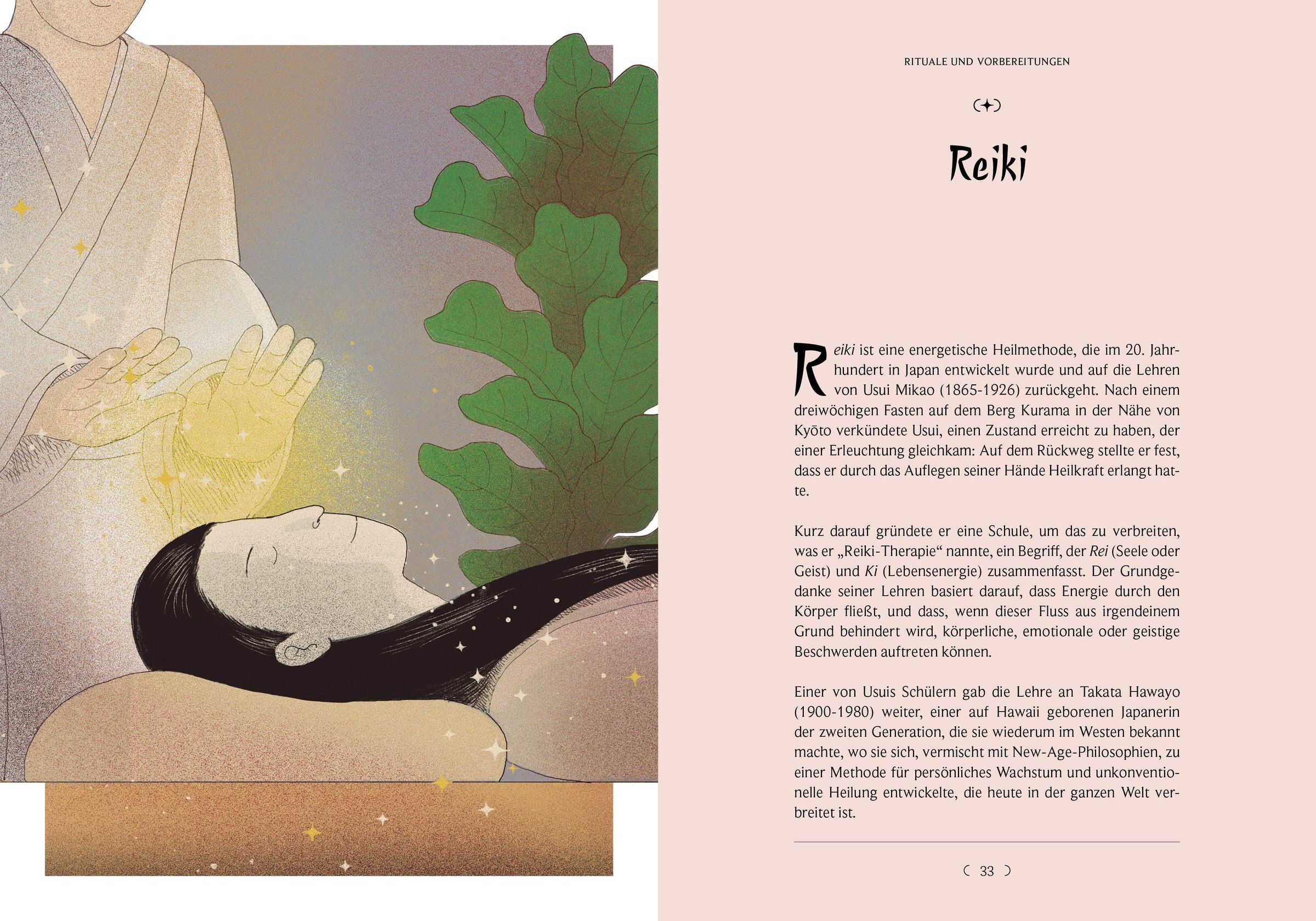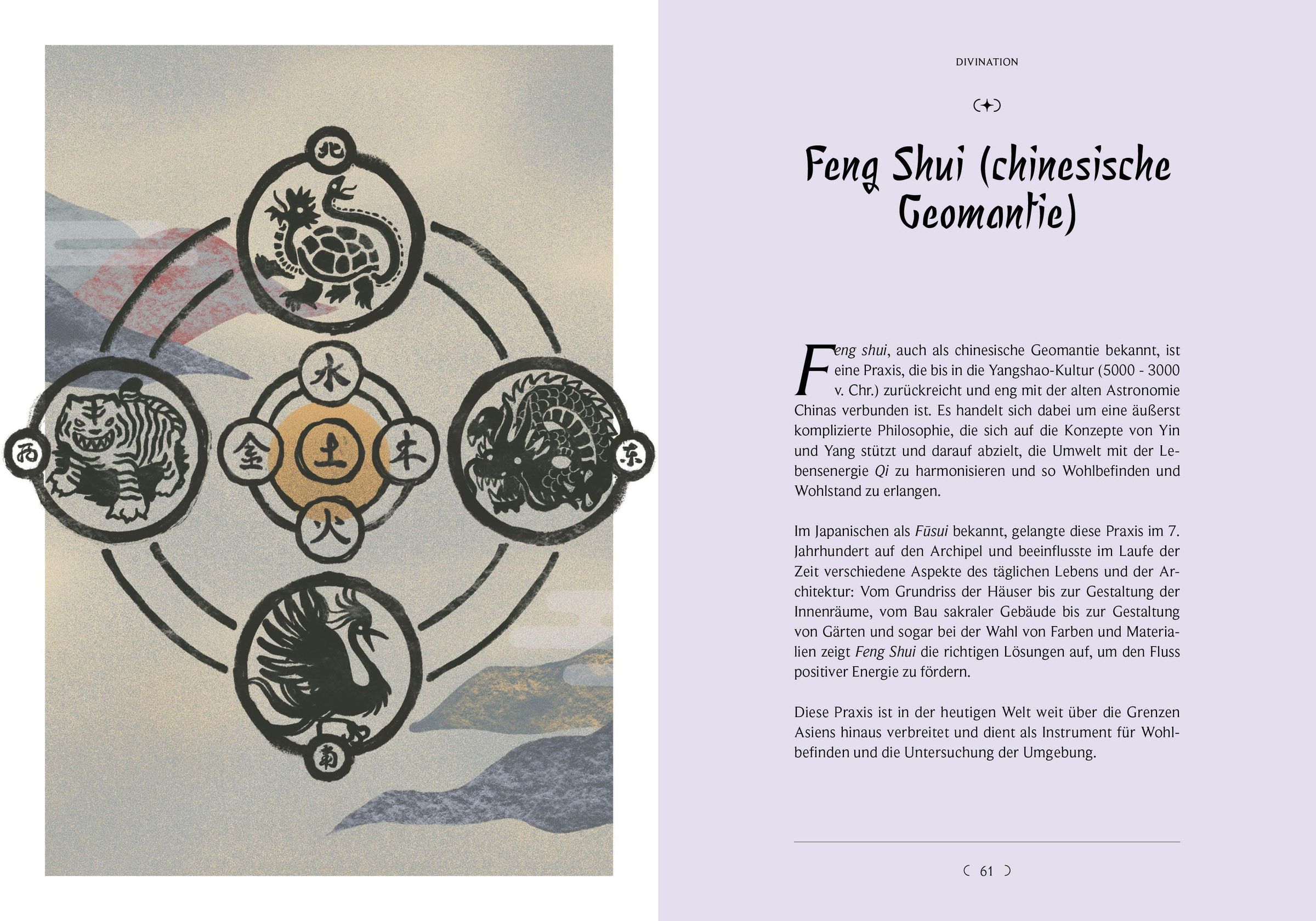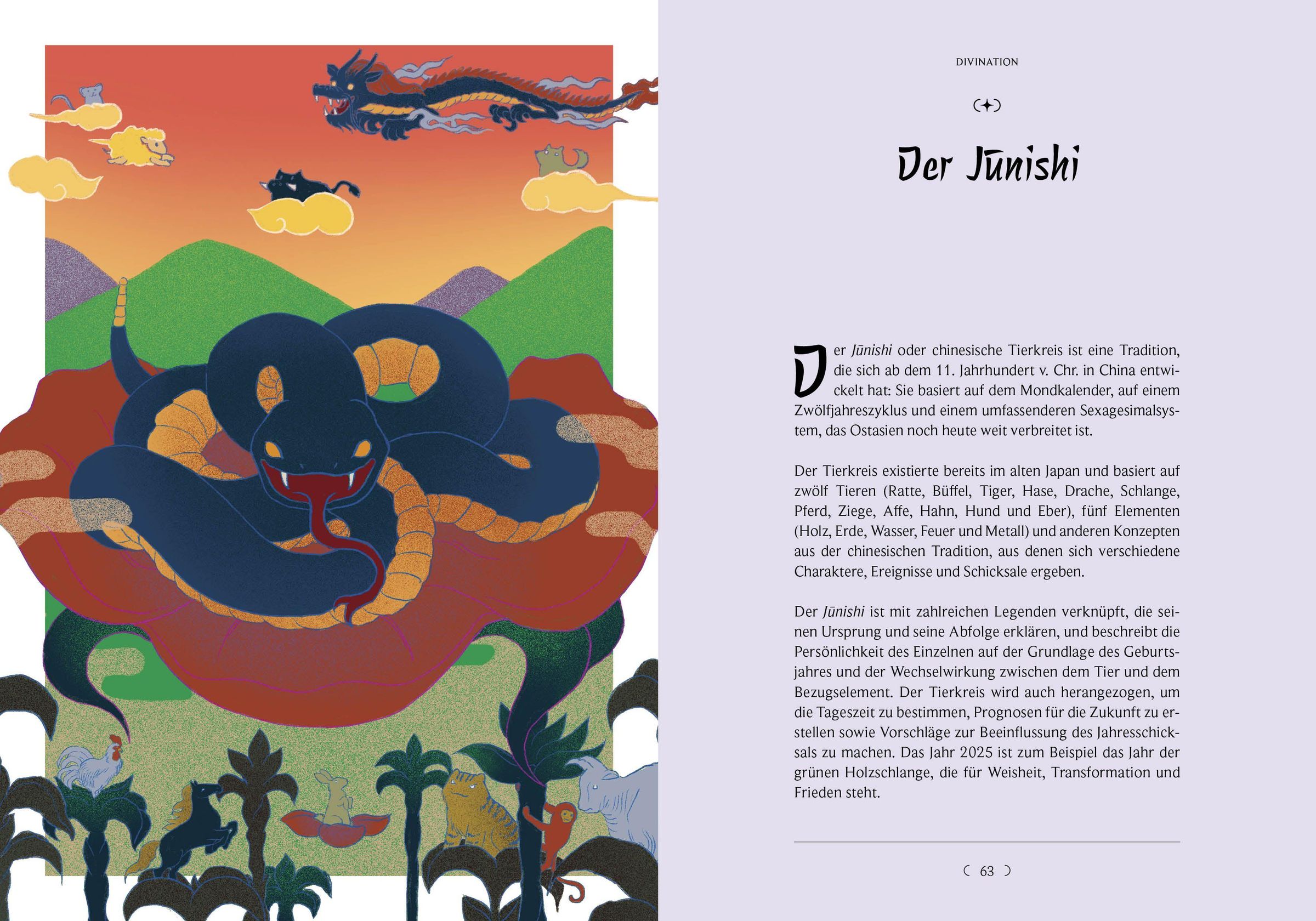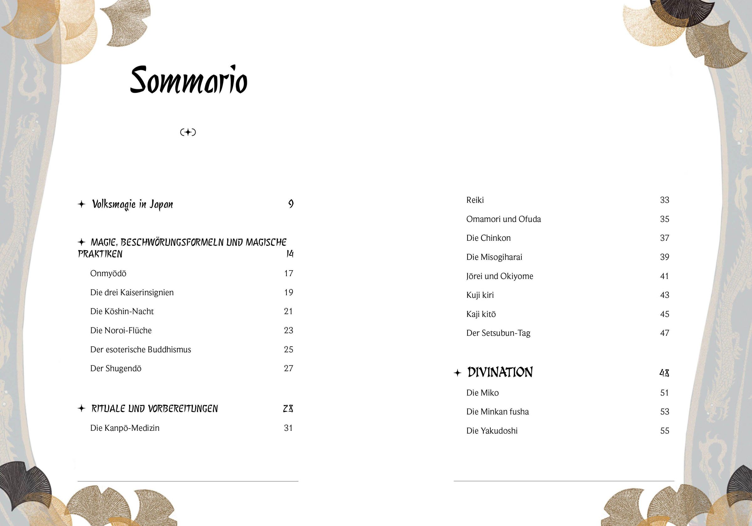 "Japan, Magie & Folklore." Illustration mit japanischen Figuren, Daruma-Puppe und traditionellen Motiven., Buch