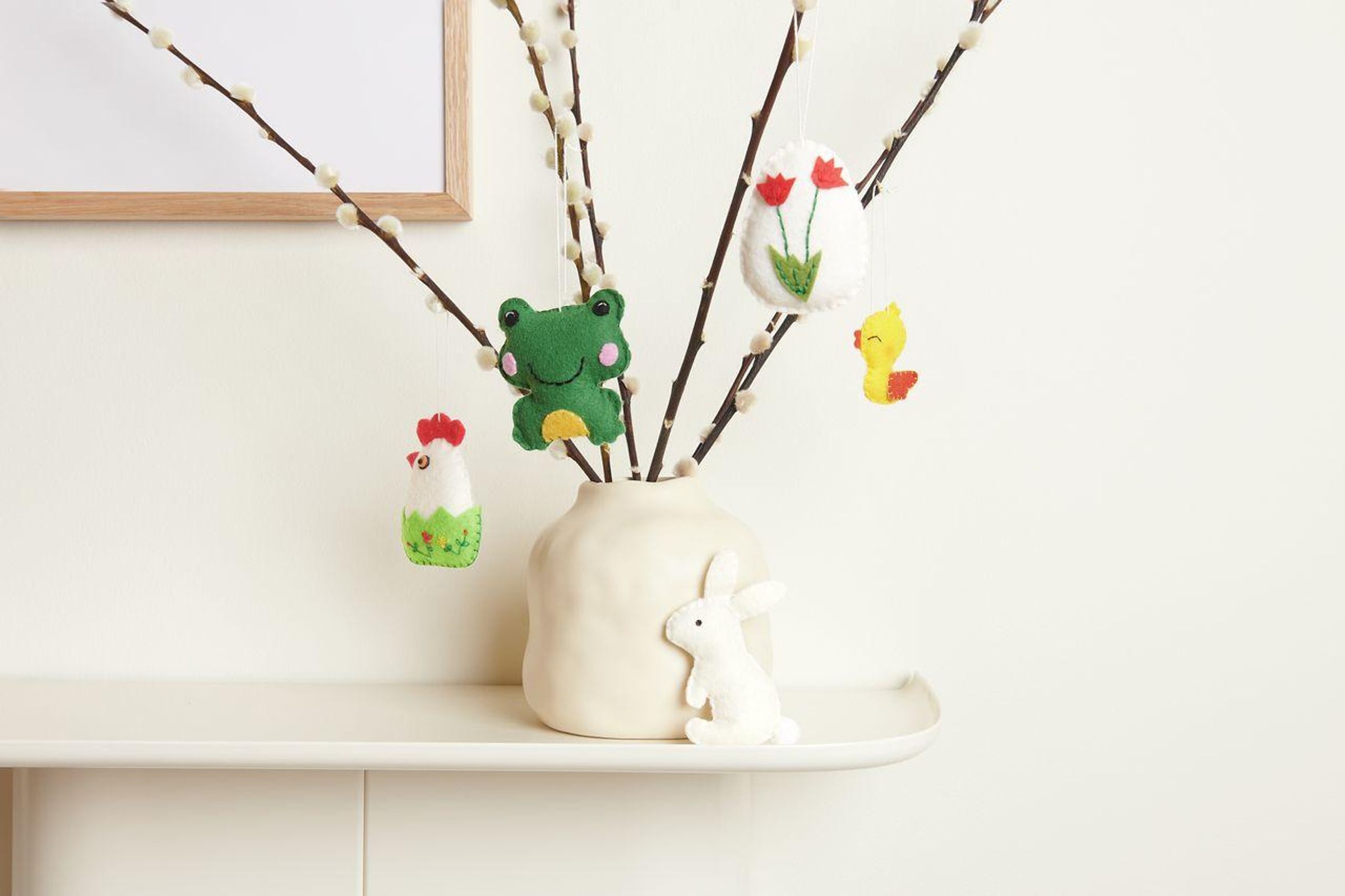 Das Filz-Aufhänger-Set mit fünf verschiedenen Osterfiguren bringt frühlingshafte Akzente in jede Dekoration. Die flachen Figuren bestehen aus robustem Polyesterfilz und sind beidseitig gearbeitet, sodass sie sich ideal zum Aufhängen an Zweigen, Fenstern oder Kränzen eignen. Mit ihren unterschiedlichen Motiven wie Hase, Huhn oder Küken entsteht eine abwechslungsreiche und charmante Osterdekoration.