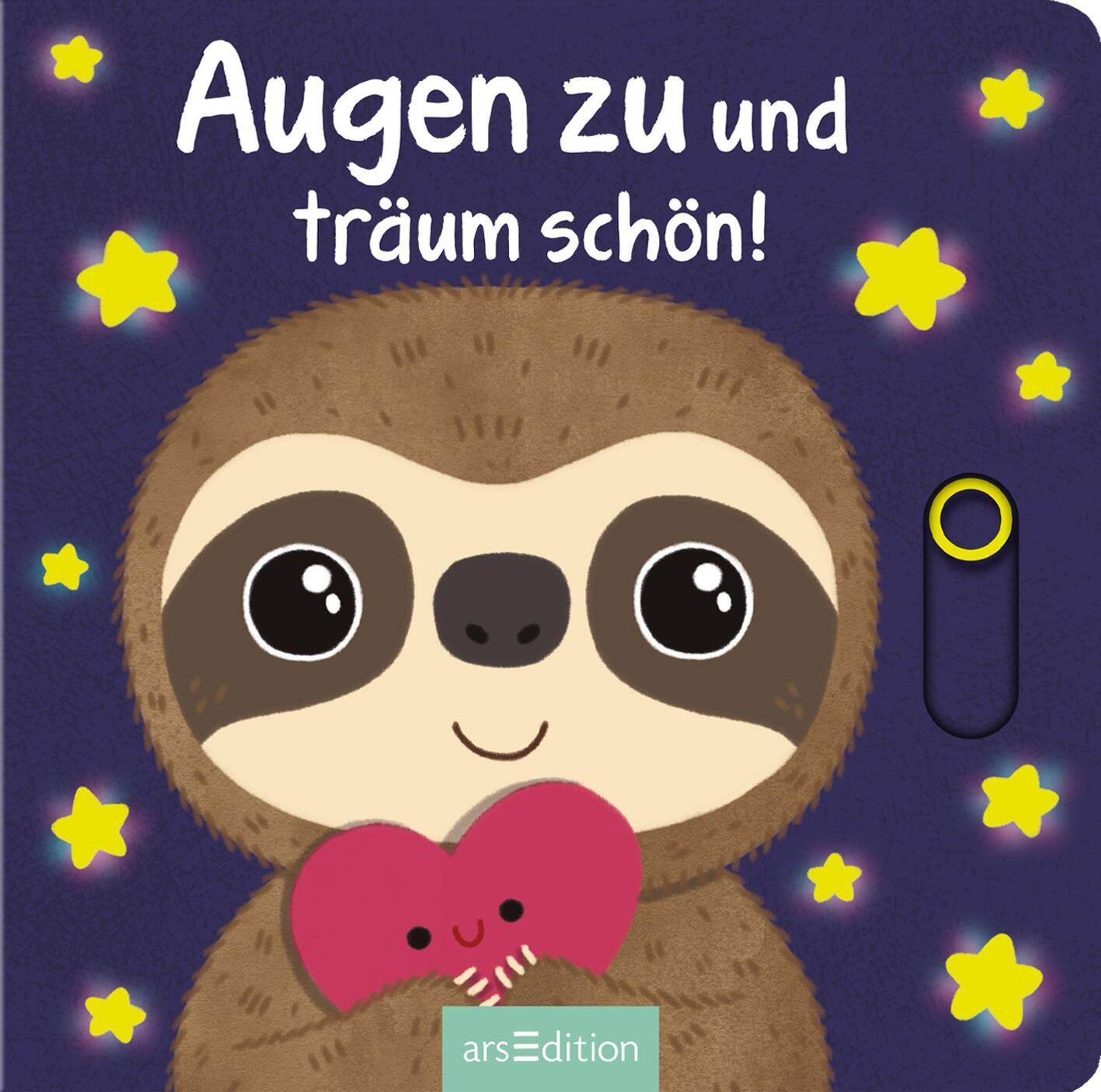 "Augen zu und träum schön!" Große Kulleraugen Faultier hält ein pinkes Herz, umgeben von gelben Sternen auf lila Hintergrund., Buch