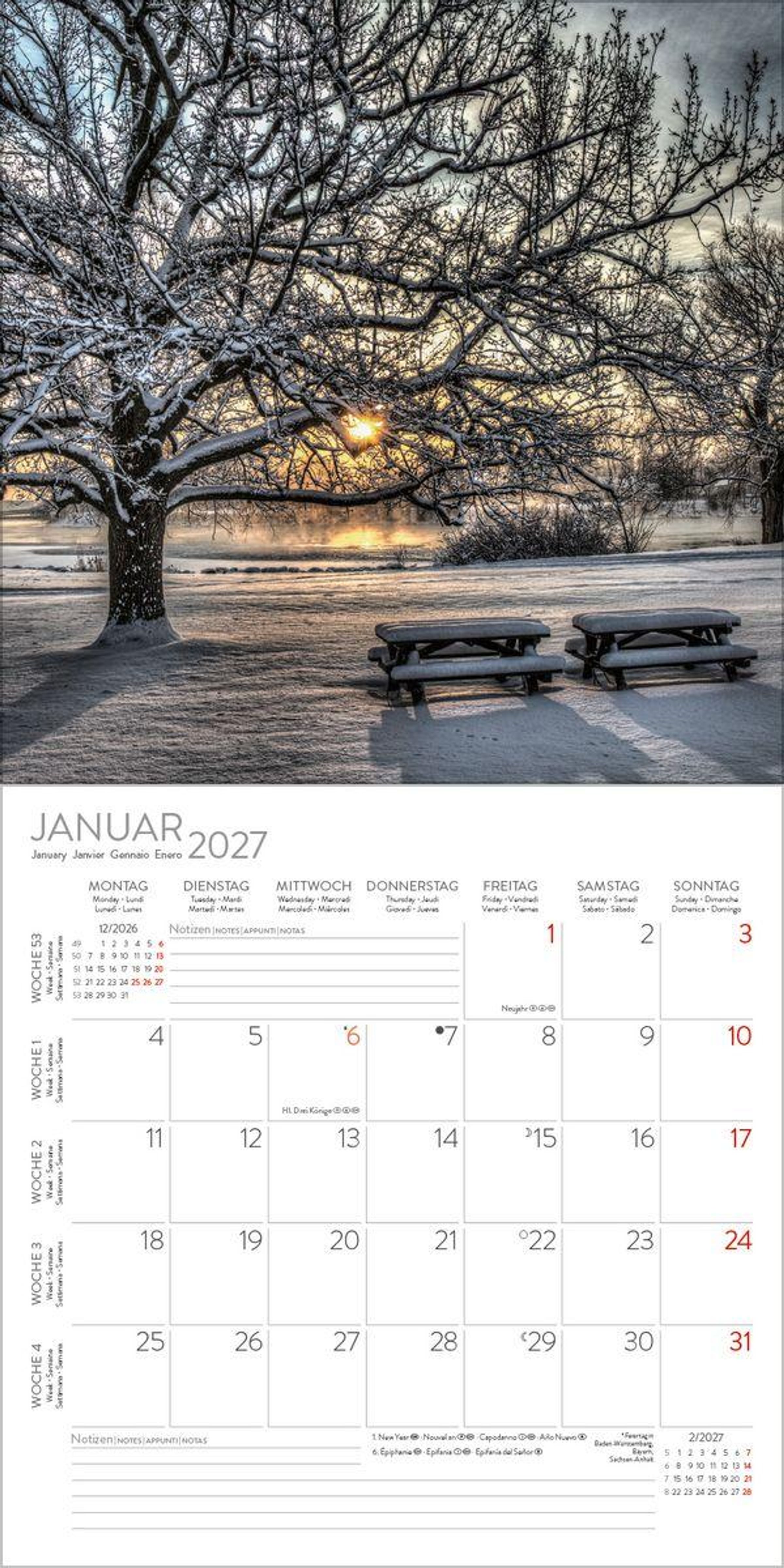 Wandkalender im Format: 30 x 30 cm; Offenes Format: 30 x 60 cm; umweltfreundliches FSC Papier Jede Kalenderseite mit großem Bild und viel Platz im Kalendarium für Notizen und Termine Mehrsprachiges Kalendarium: DE/GB/FR/IT/ES mit Feiertagen für D/A/CH/GB/FR/IT/ES Regionale Ferienzeiten für DE/A/CH Monatsübersicht für den jeweiligen Vor- und Nachmonat; Jahresübersicht