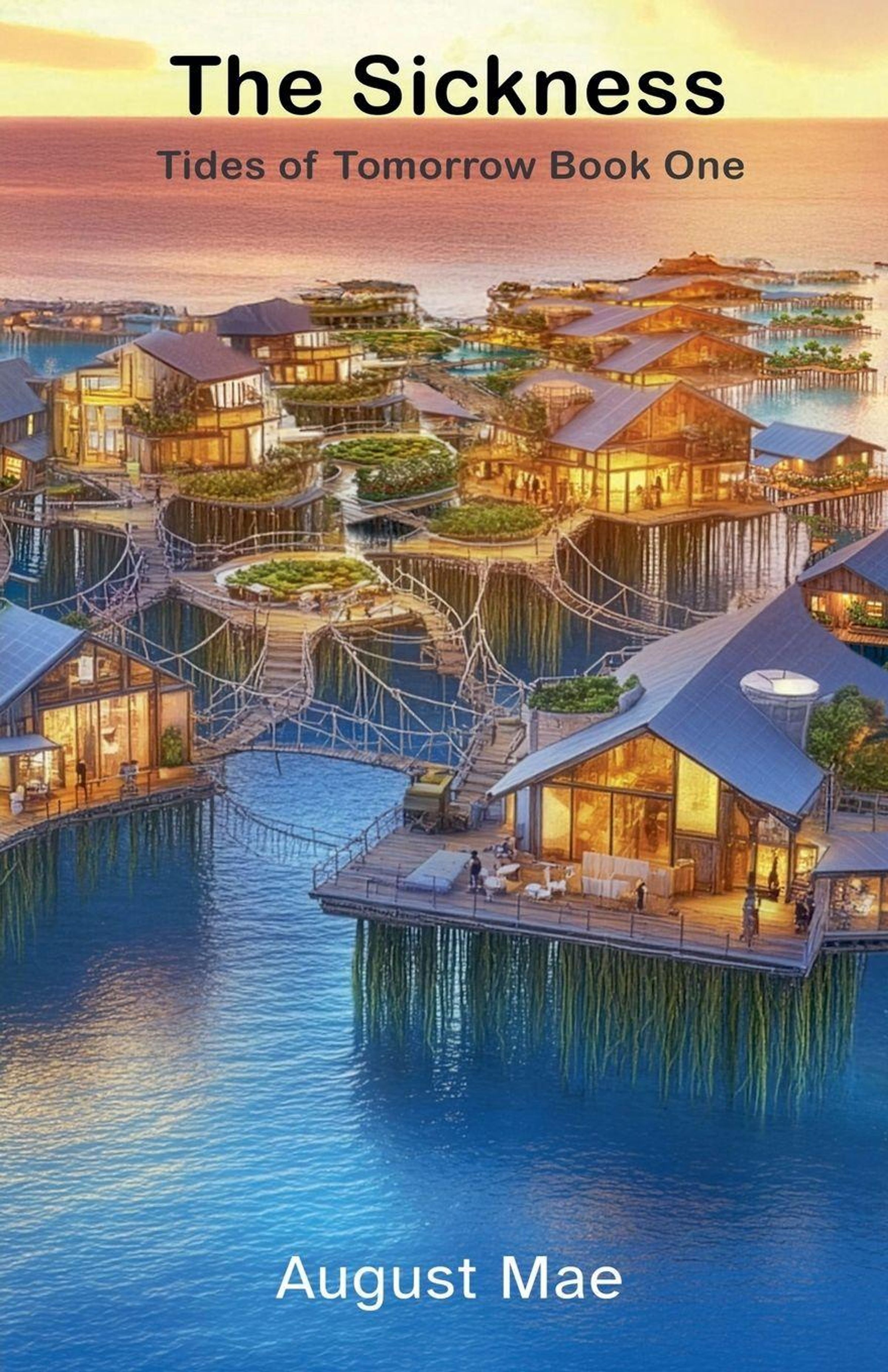 "The Sickness", "Tides of Tomorrow Book One", "August Mae". Über Wasser gebaute Häuser, verbunden durch Brücken, bei Sonnenuntergang., Buch