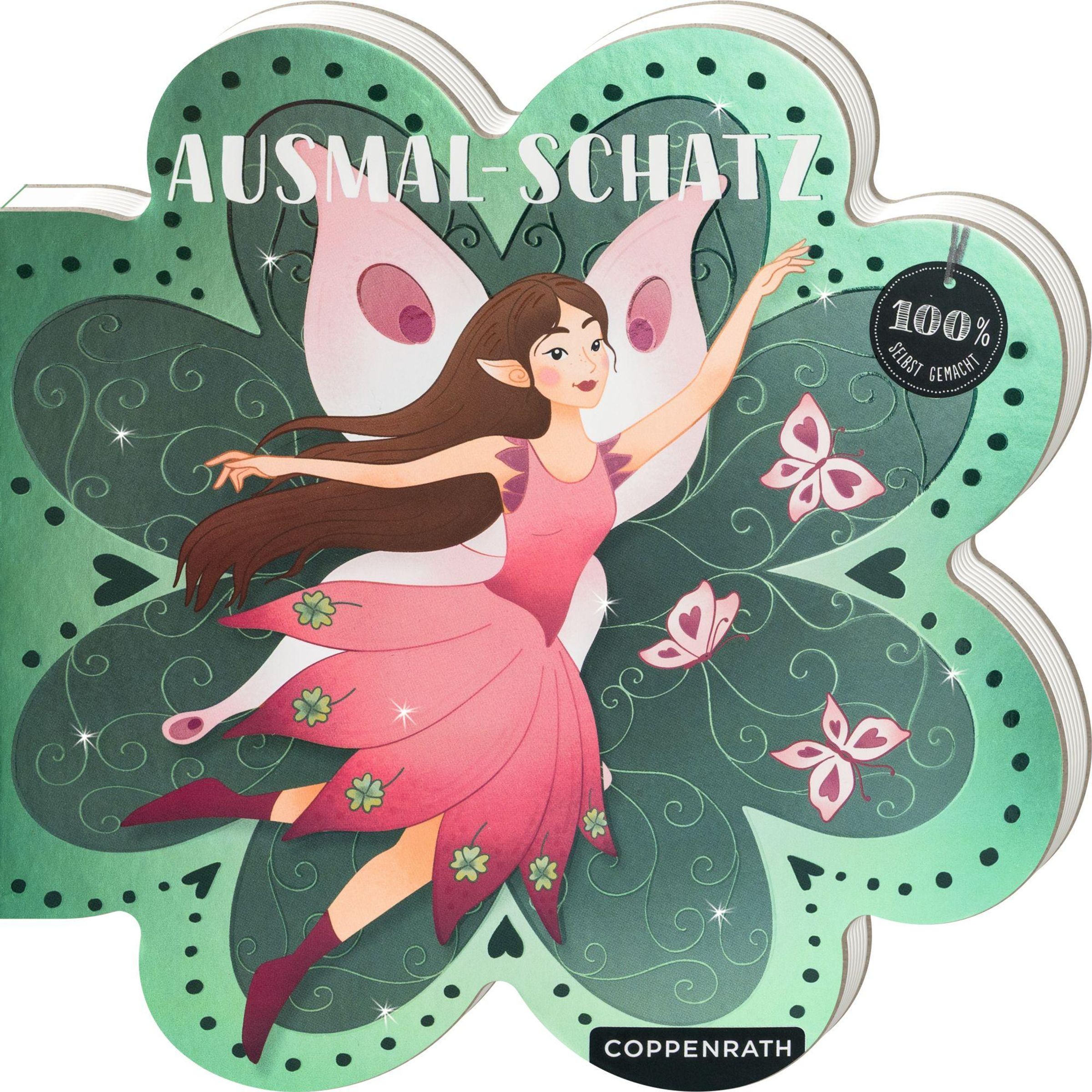 "AUSMAL-SCHATZ" steht oben. Illustration: Eine Fee mit rosa Kleid und Flügeln tanzt auf einem grünen, floralen Hintergrund., Buch