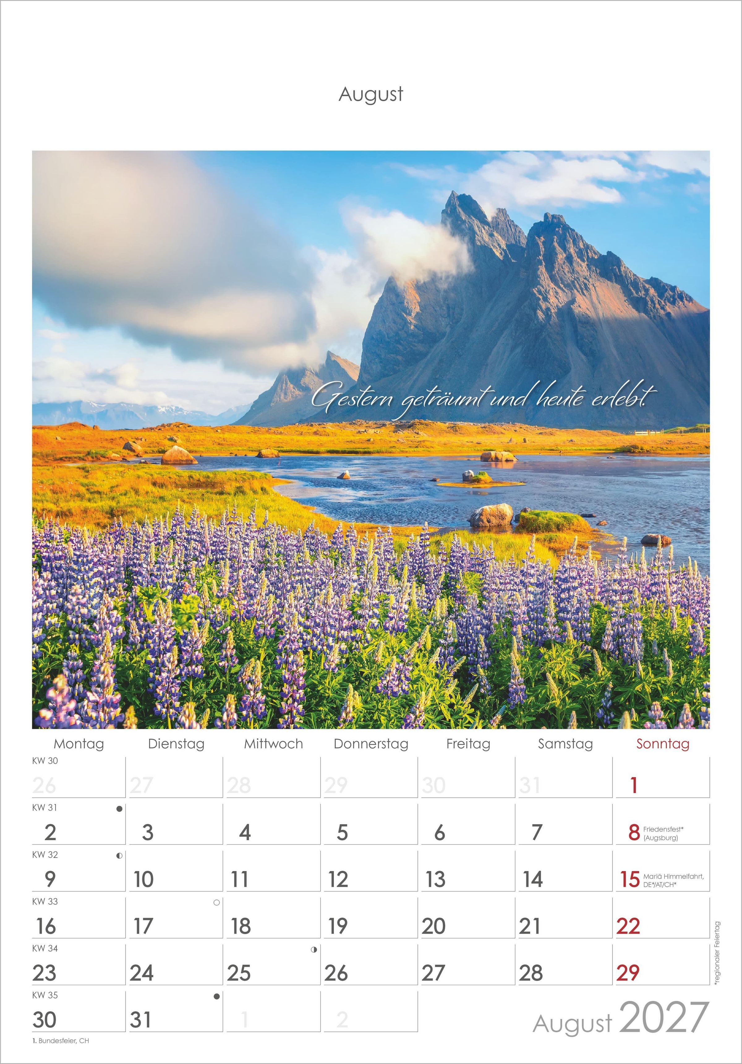 Übersichtliche Monatsansicht: Deutschsprachiges Kalendarium mit Feiertagen für DE/AT/CH