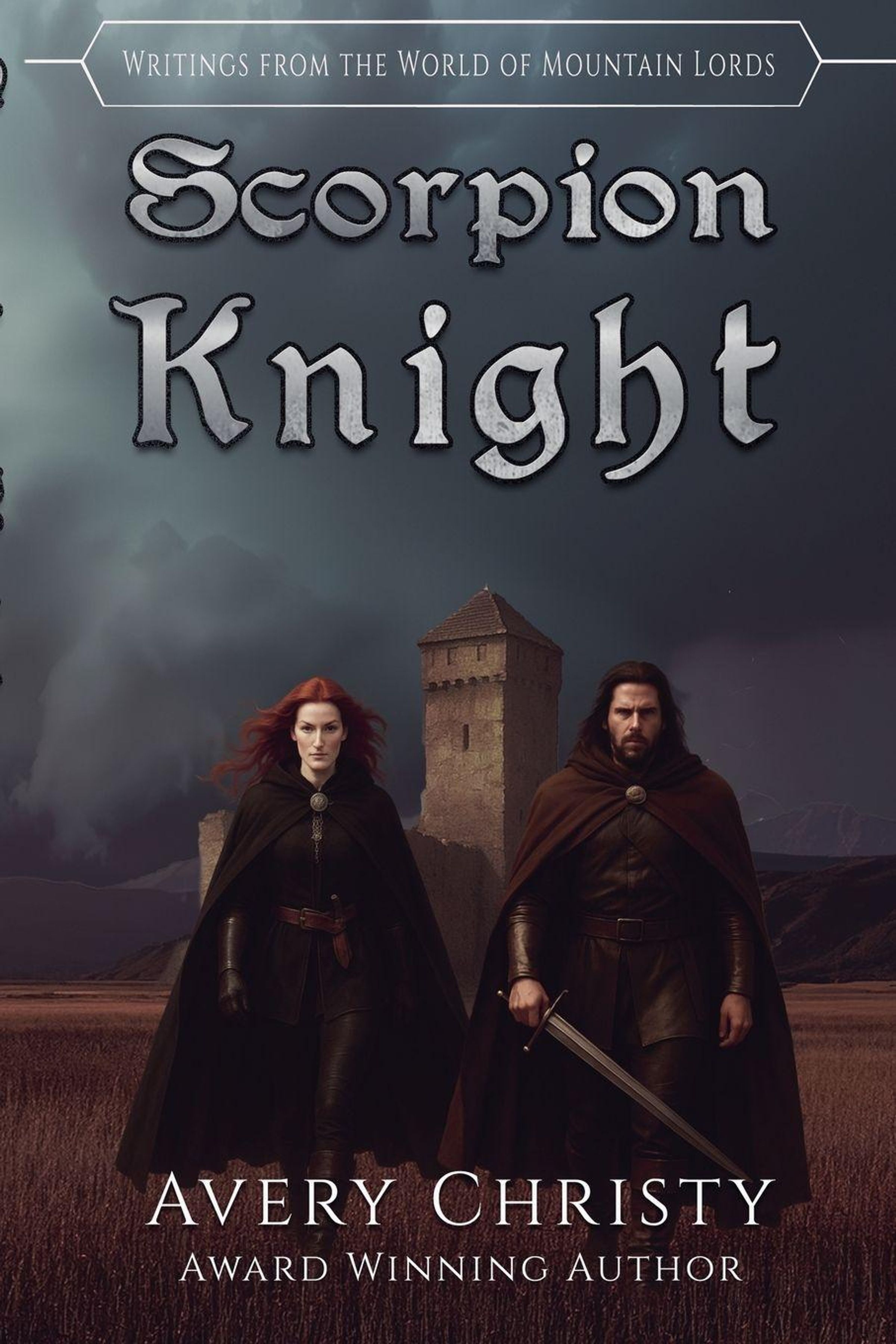 „Scorpion Knight“ von Avery Christy. Zwei Personen in dunklen Umhängen vor einem Turm unter düsterem Himmel., Buch