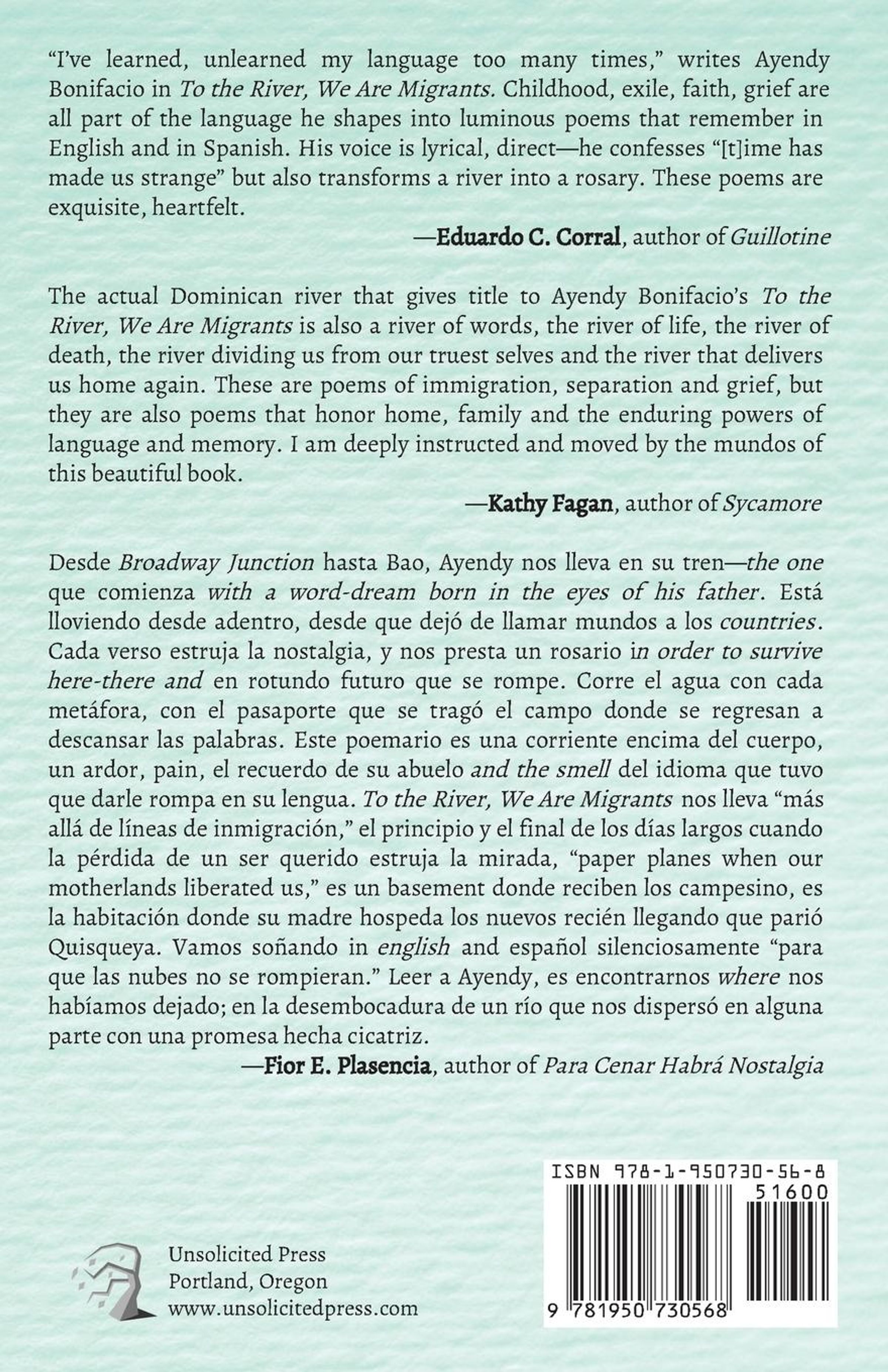 To the River, We Are Migrants is Ayendy Bonifacio's debut collection. In this nostalgic volume, the image of the river carries us to and away from home. The river is a timeline that harkens back to Bonifacio's childhood in the Dominican Republic and ends with the sudden passing of his father. Through panoramic and time-bending gazes, To the River, We Are Migrants leads us through the rural foothills of Bonifacio's birthplace to the streets of East New York, Brooklyn. These lyrical poems, using both English and Spanish, illuminate childhood visions and memories and, in doing so, help us better understand what it means to be a migrant in these turbulent times.