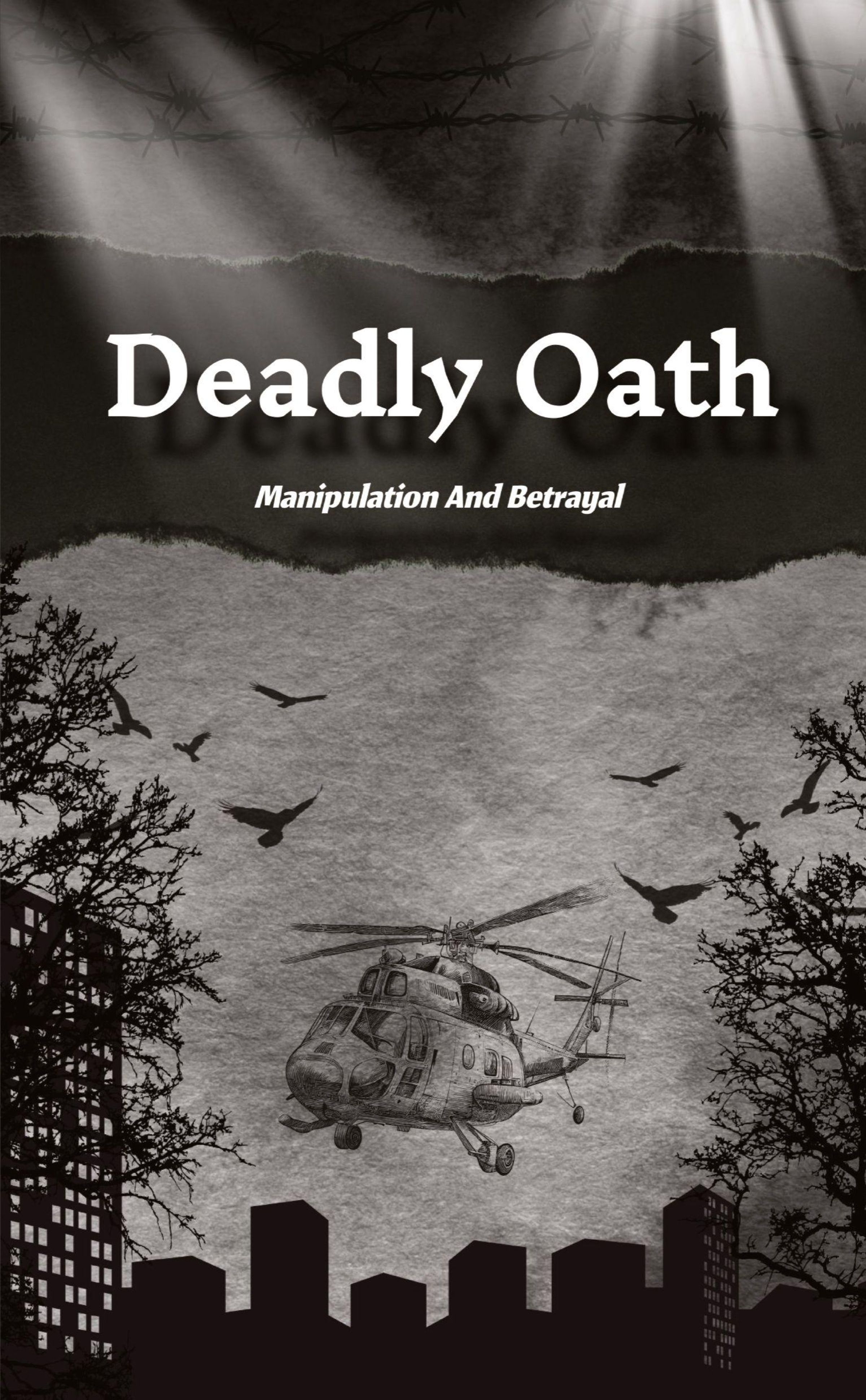 "Deadly Oath. Manipulation And Betrayal." Ein Hubschrauber fliegt zwischen Bäumen und Gebäuden, umgeben von Vögeln., Buch